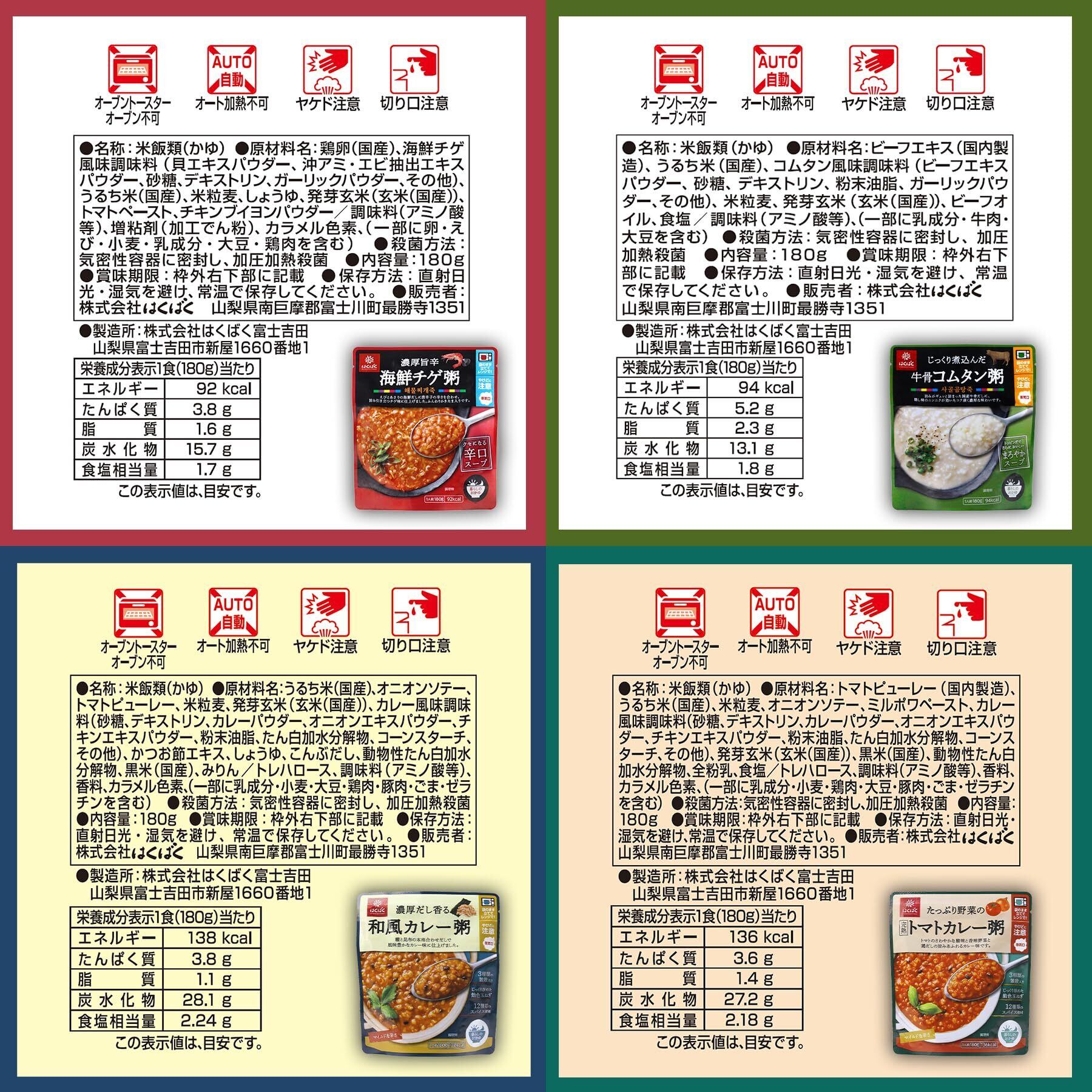 【チゲ粥】鶏卵(国産)、海鮮チゲ風味調味料(貝エキスパウダー、沖アミ・エビ抽出エキスパウダー、砂糖、デキストリン、ガーリックパウダー、その他)、うるち米(国産)、米粒麦、しょうゆ、発芽玄米(玄米(国産))、トマトペースト、チキンブイヨンパウダー/調味料(アミノ酸等)、増粘剤(加工でん粉)、カラメル色素、(一部に卵・えび・小麦・乳成分・大豆・鶏肉を含む) 【コムタン粥】ビーフエキス(国内製造)、うるち米(国産)、コムタン風味調味料(ビーフエキスパウダー、砂糖、デキストリン、粉末油脂、ガーリックパウダー、その他)、米粒麦、発芽玄米(玄米(国産))、ビーフオイル、食塩/調味料(アミノ酸等)、(一部に乳成分・牛肉・大豆を含む) 【和風カレー粥】うるち米(国産)、オニオンソテー、トマトピューレー、米粒麦、発芽玄米(玄米(国産))、カレー風味調味料(砂糖、デキストリン、カレーパウダー、オニオンエキスパウダー、チキンエキスパウダー、粉末油脂、たん白加水分解物、コーンスターチ、その他)、かつお節エキス、しょうゆ、こんぶだし、動物性たん白加水分解物、黒米(国産)、みりん/トレハロース、調味料(アミノ酸等)、香料、カラメル色素、(一部に乳成分・小麦・大豆・鶏肉・豚肉・ごま・ゼラチンを含む) 【トマトカレー粥】トマトピューレー(国内製造)、うるち米(国産)、米粒麦、オニオンソテー、ミルポワペースト、カレー風味調味料(砂糖、デキストリン、カレーパウダー、オニオンエキスパウダー、チキンエキスパウダー、粉末油脂、たん白加水分解物、コーンスターチ、その他)、発芽玄米(玄米(国産))、黒米(国産)、動物性たん白加水分解物、全粉乳、食塩/トレハロース、調味料(アミノ酸等)、香料、カラメル色素、(一部に乳成分・小麦・鶏肉・大豆・鶏肉・豚肉・ごま・ゼラチンを含む)