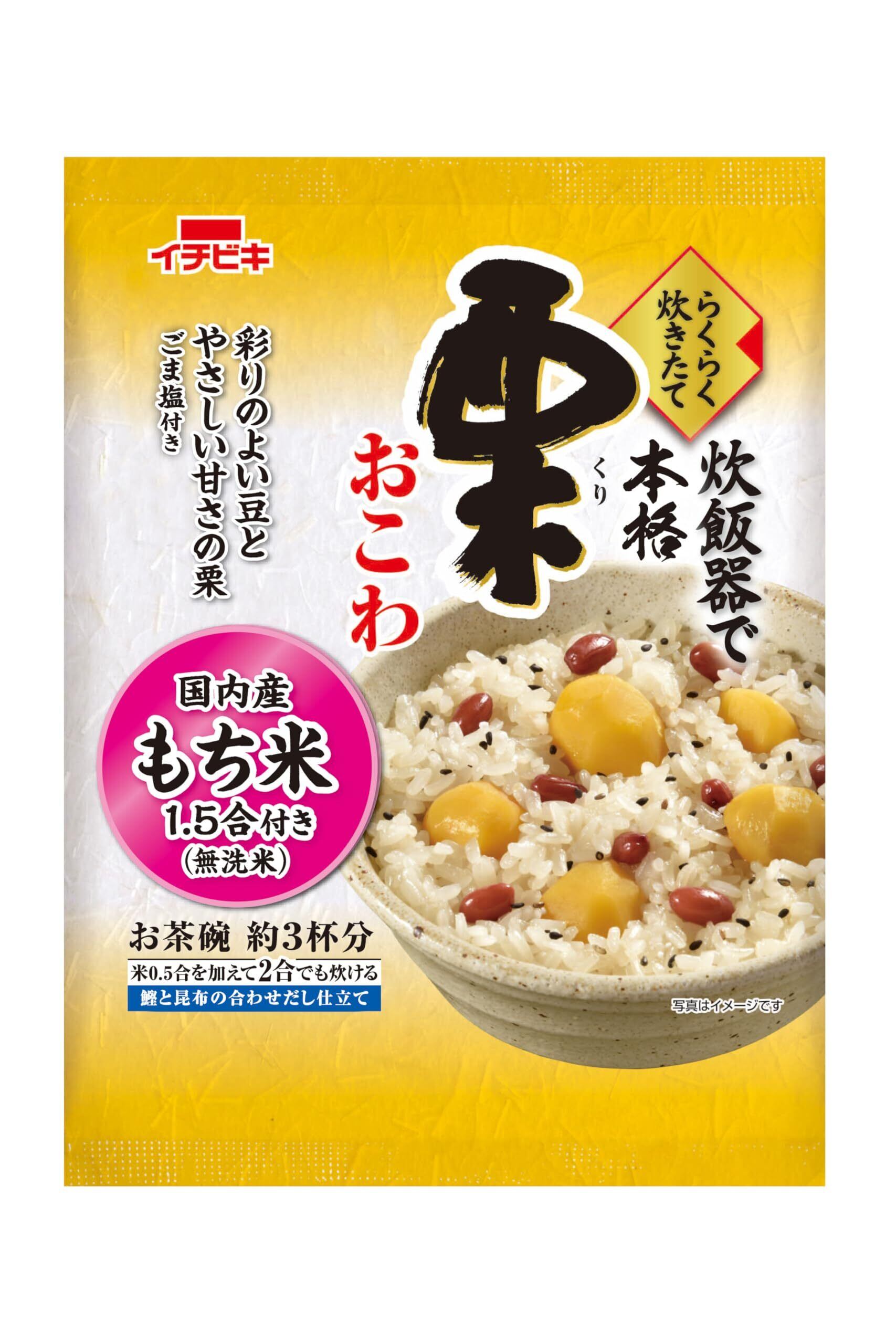 無洗米[もち米(国産)]栗おこわの具[栗、赤いんげん豆、砂糖、還元水あめ、米発酵調味料、しょうゆ、食塩、鰹節エキス、昆布エキス/酸化防止剤(ビタミンC)、乳酸Ca、クチナシ色素、(一部に小麦・大豆を含む)]ごま塩[ごま、食塩、もち米加工品、(一部にごまを含む)]