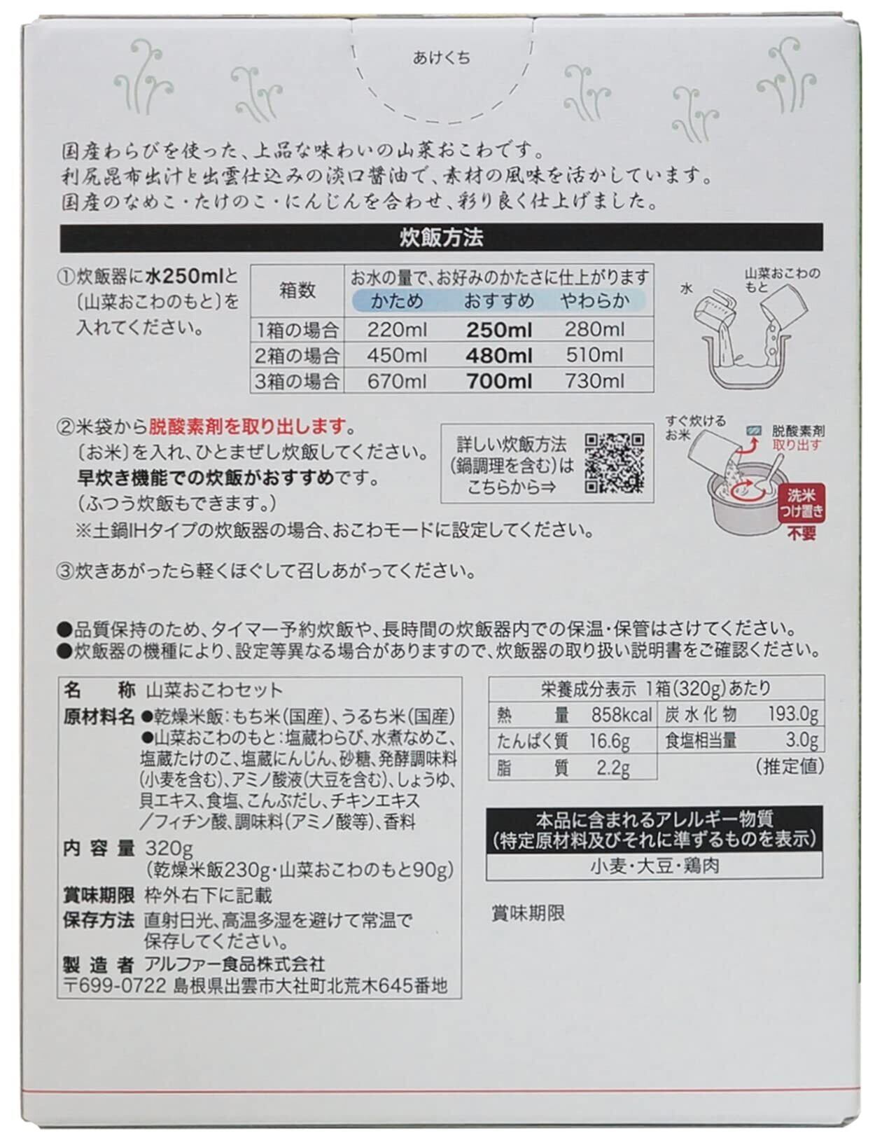・内容量320g(乾燥米飯230g、山菜おこわのもと90g)