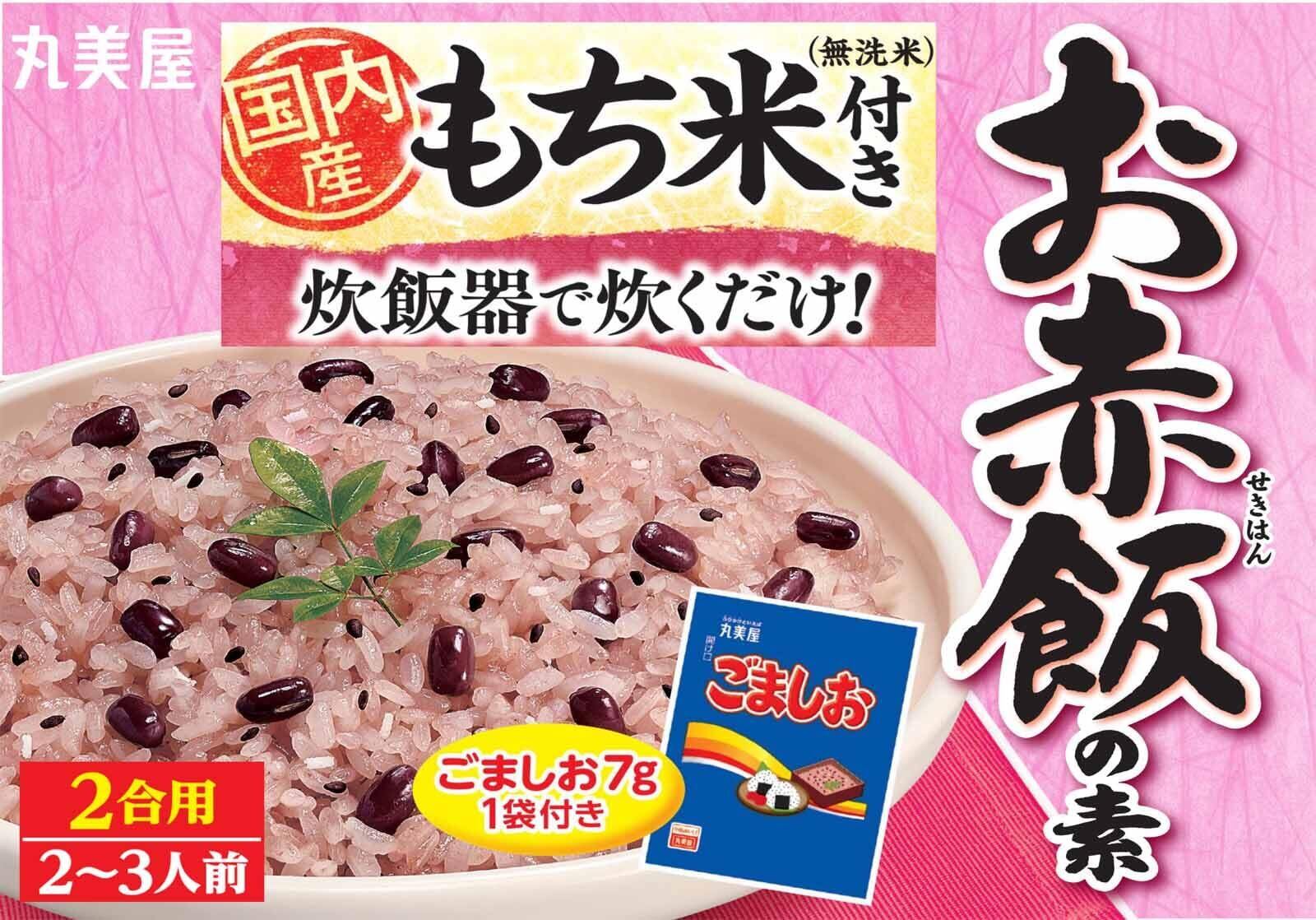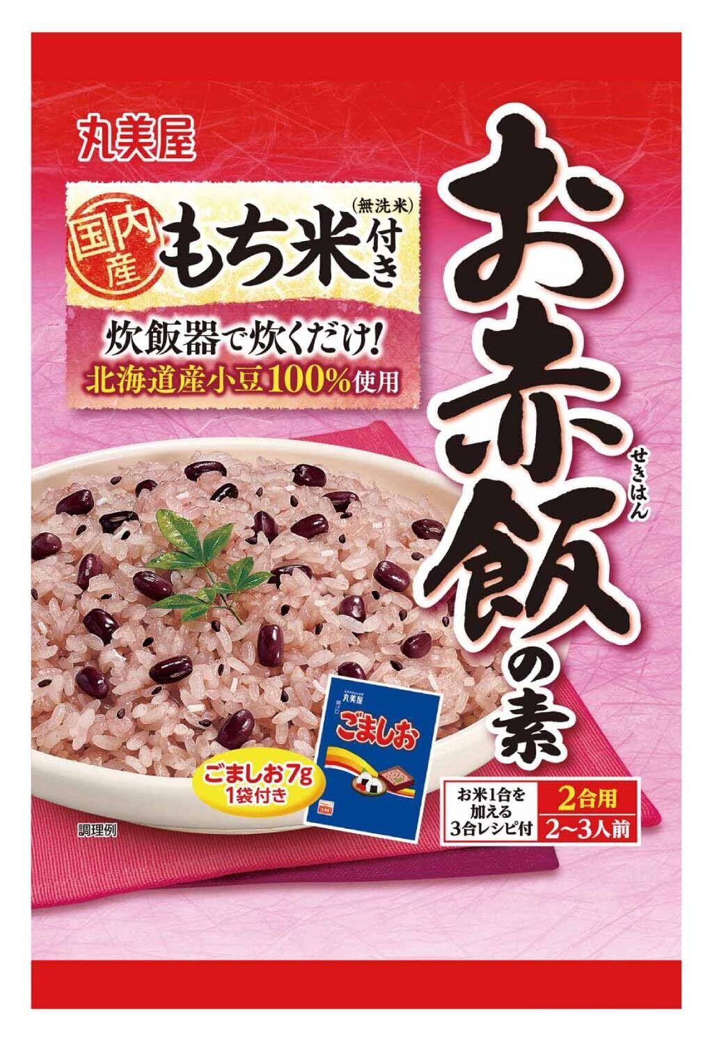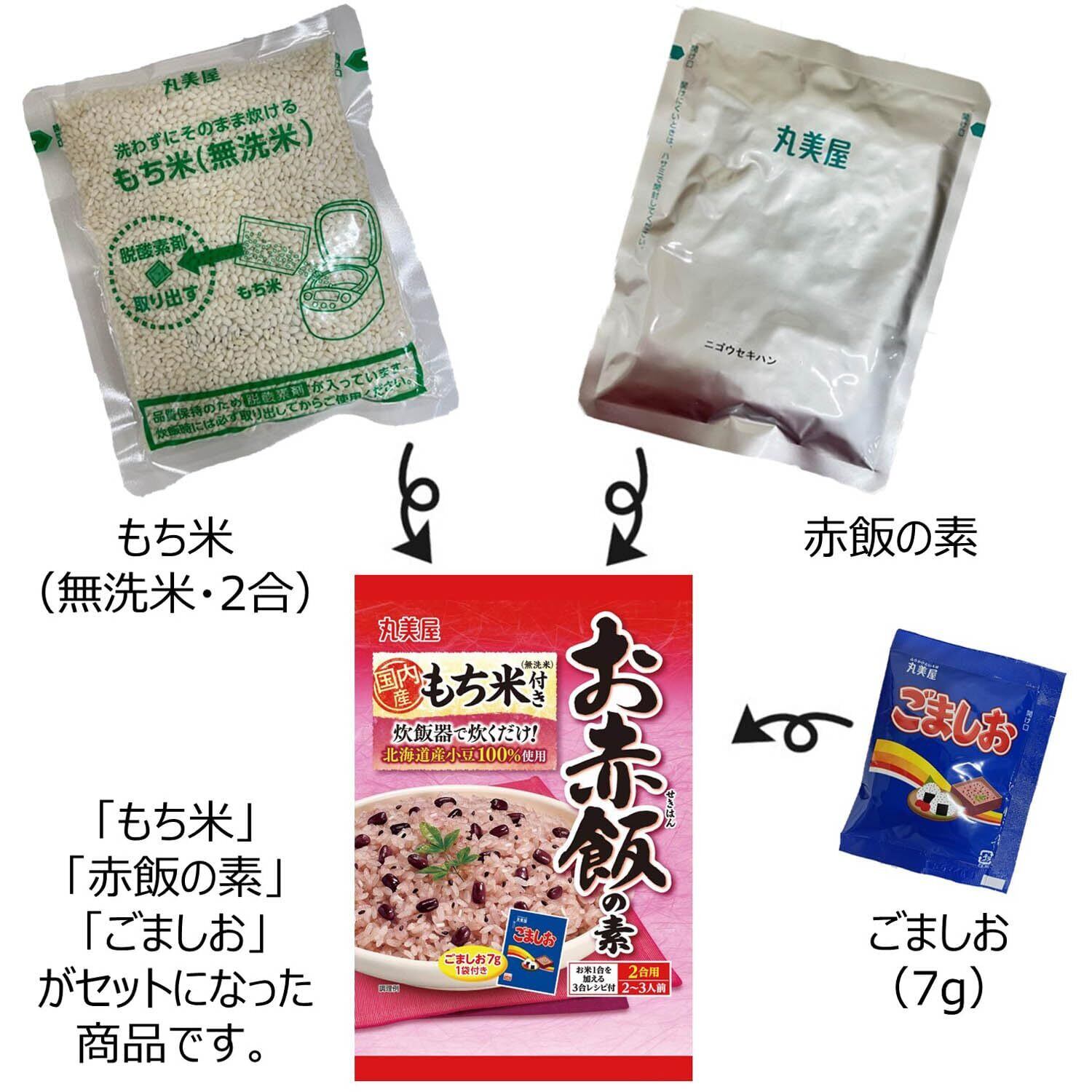 [無洗米]もち米(国産)| [赤飯の素]小豆、砂糖、小豆抽出液、食塩/乳酸カルシウム、重曹| [ごましお]いりごま、食塩、でん粉、海藻カルシウム/調味料(アミノ酸等)、(一部にごまを含む)