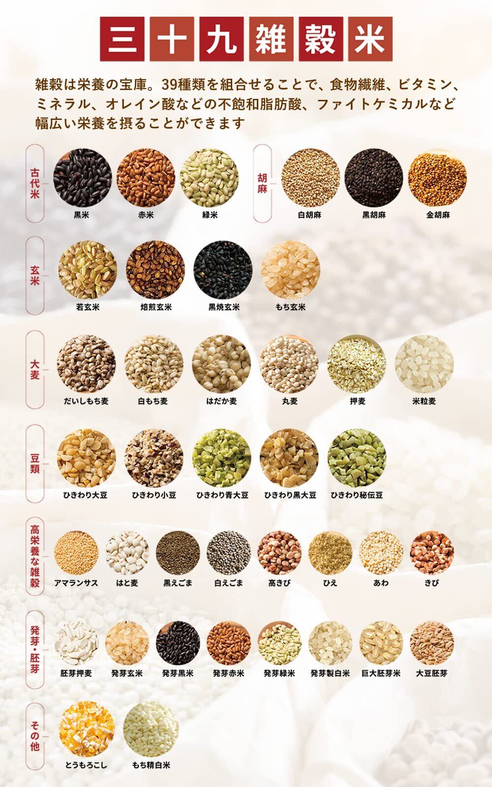 栄養が豊富である国産雑穀が39種類。主な栄養素として、βグルカン含む食物繊維、ビタミン(葉酸含むB群、E)、ミネラル(カルシウム、カリウム、亜鉛、マグネシウム、マンガン、リン)、オレイン酸、リノール酸、リノレン酸などの不飽和脂肪酸、ポリフェノールやカロテンなど第七の栄養素と言われるファイトケミカルなど。