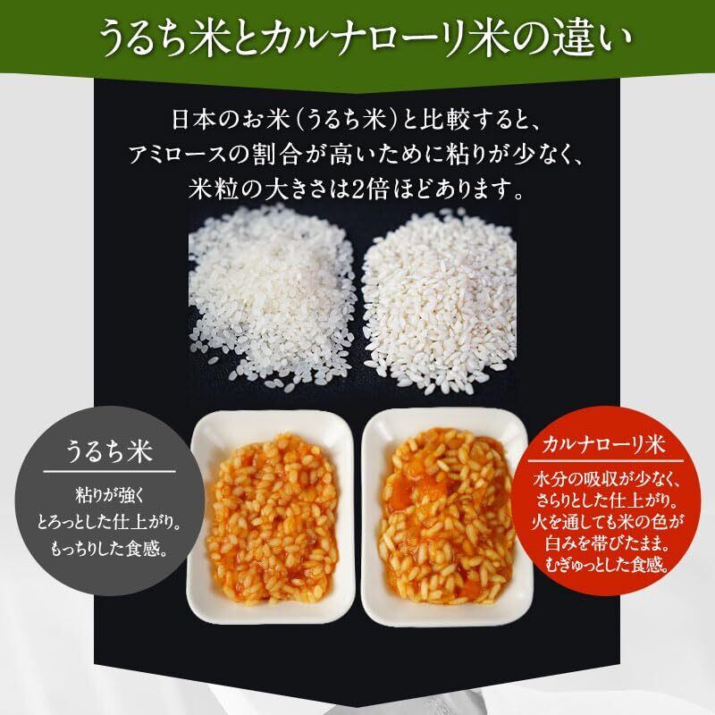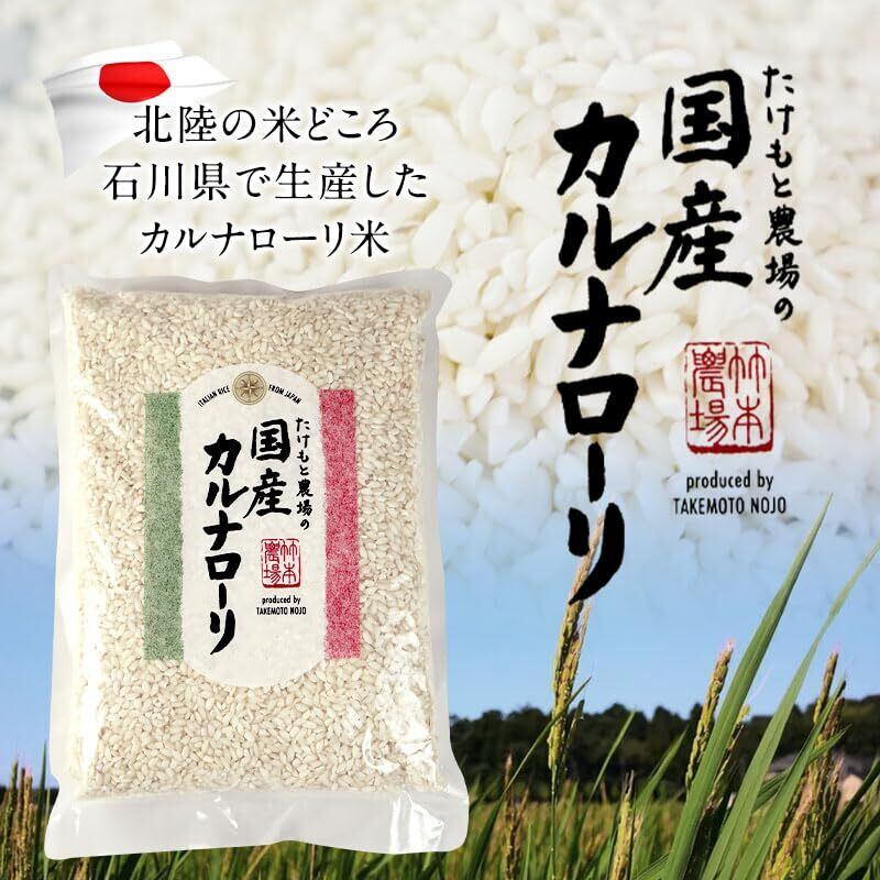[うるち米とカルナローリ米の違い] 日本のお米(うるち米)と比較すると、アミロースの割合が高いために粘りが少なく、米粒の大きさは2倍ほどあります。 ・うるち米はもちもち感、カルナローリは少しむぎゅっとした食感 ・カルナローリの方が水分の吸収が少ない ・うるち米よりカルナローリの方がトロミが少なくサラッとした仕上がり ・火を通してもカルナローリは米の色が白みを帯びたまま こちらの商品はイタリアのカルナローリ種を北陸の米どころ・石川県で生産した国産米! リゾットにももちろんですが、スペインの代表的料理・パエリアに使っても美味しく召し上がっていただけます。 カルナローリ米を使って、ご家庭で本格的なリゾットやパエリアを作ってみませんか?