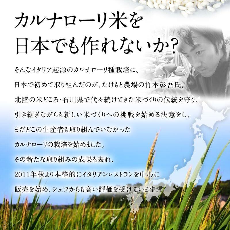 イタリアではリゾットに欠かせないお米!リゾットの美味しさを引き出す『国産カルナローリ米』 お家でリゾットを作ってみたはいいものの、お米がべちゃっとして雑炊みたいになってしまった経験ありませんか? 日本で作られているお米の品種の多くは粒が小さくつぶれやすいので、実はリゾットには不向き。しっかり粒が立ったアルデンテなリゾットを作るには、イタリア原産のカルナローリ種が最適。調味料を吸収する能力が高く、煮崩れしにくい、リゾットを作るのに最適な、イタリアでもポピュラーな品種です。 そんなイタリア起源のカルナローリ種栽培に、日本で初めて取り組んだのが、たけもと農場の竹本彰吾氏。北陸の米どころ・石川県で代々続けてきた米づくりの伝統を守り、引き継ぎながらも新しい米づくりへの挑戦を始める決意をし、まだどこの生産者も取り組んでいなかったカルナローリの栽培を始めました。その新たな取り組みの成果も表れ、201秋より本格的にイタリアンレストランを中心に販売を始め、シェフからも高い評価を受けています。