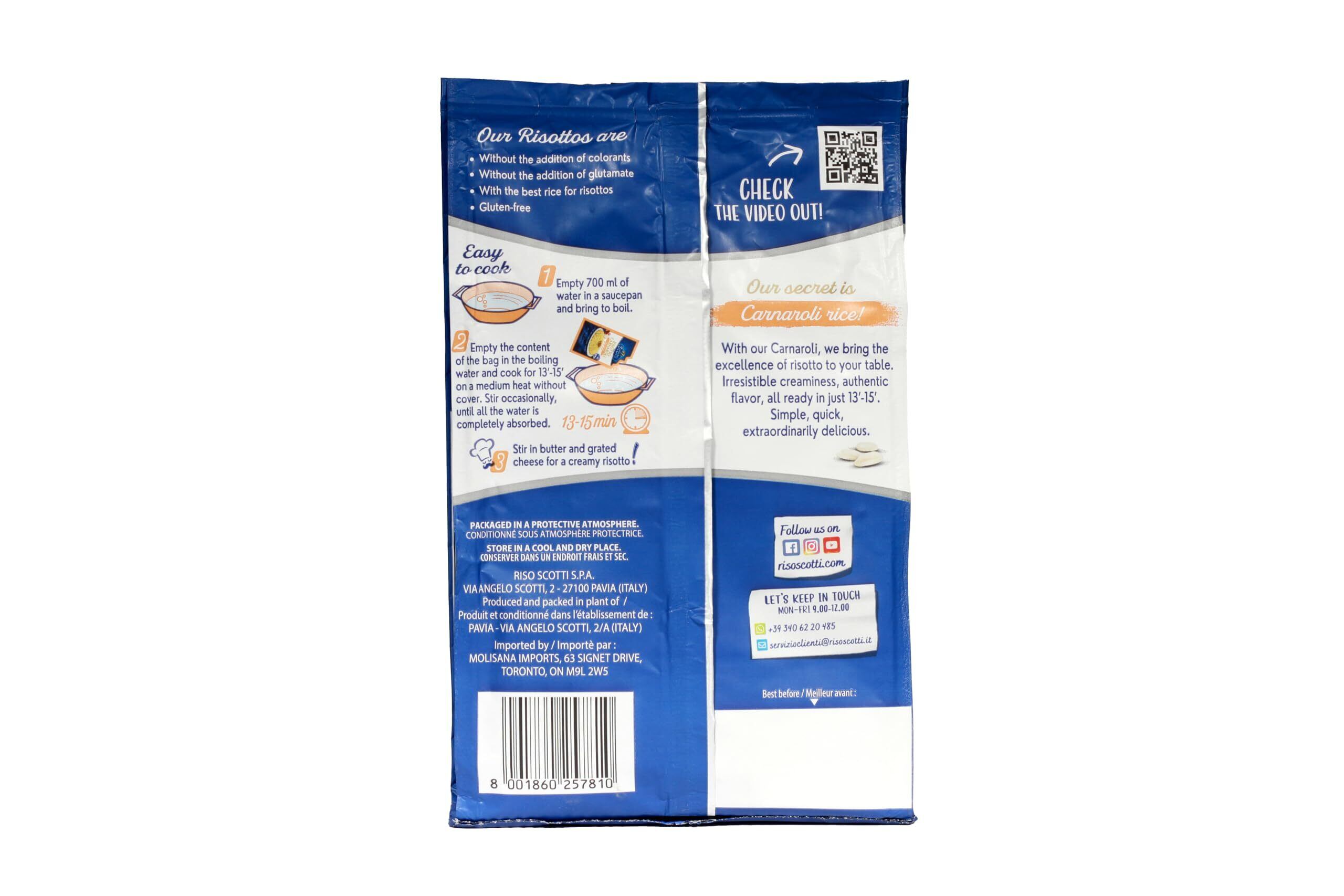 原材料:カルナローリ米(イタリア産)、米粉(イタリア産、ルーマニア産)、ホエイ(乳製品)、粉チーズ、食塩、たまねぎ、オリーブオイル、グルコースシロップ、ミルクプロテイン、全粉乳、サフラン、香料