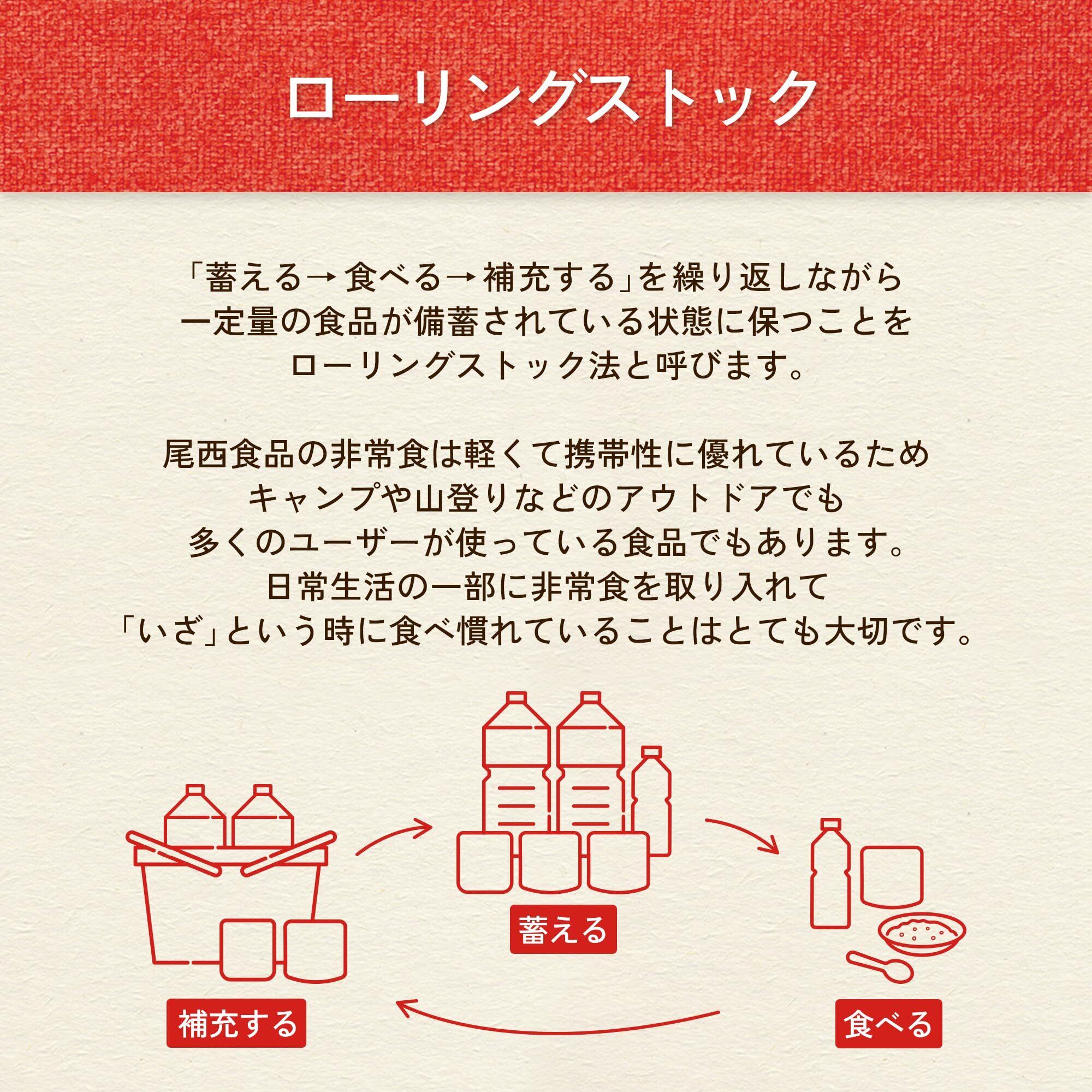 1人3日分を想定しています。すぐに食べられる「ひだまりパン」。持ち運びに優れ、食べる場所を選ばない「携帯おにぎり」。お腹を満たすボリュームたっぷりな「アルファ米」。アルファ米はお湯(待ち時間15分)または水(待ち時間60分)を注いでご飯ができあがります。賞味期限は(製造月から)5年6ヶ月、流通期間6ヶ月として、お客様には保存期間5年以上ある状態でお届けできるようにしております。しかしながら、販売状況によっては5年を下回ることもございますので、ご了承いただけますようお願いいたします。