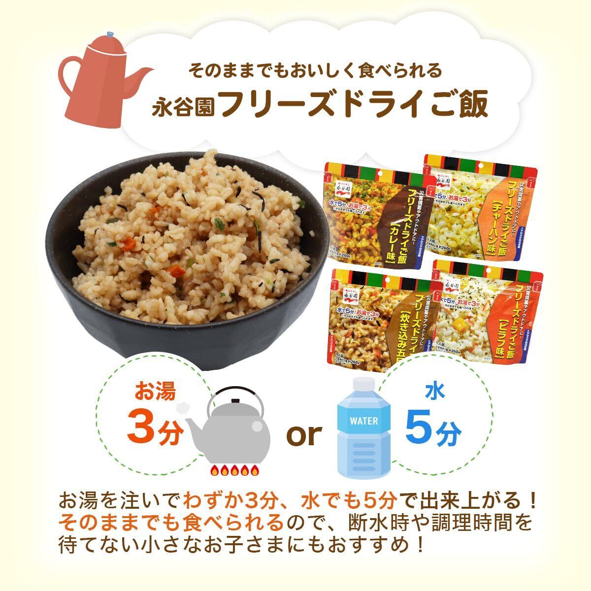 【ポイント】災害発生直後は水の入手が困難な場合があります。その時はフリーズドライご飯をそのまま食べられます。水の支援物資が届き始めたら調理して食べてください。