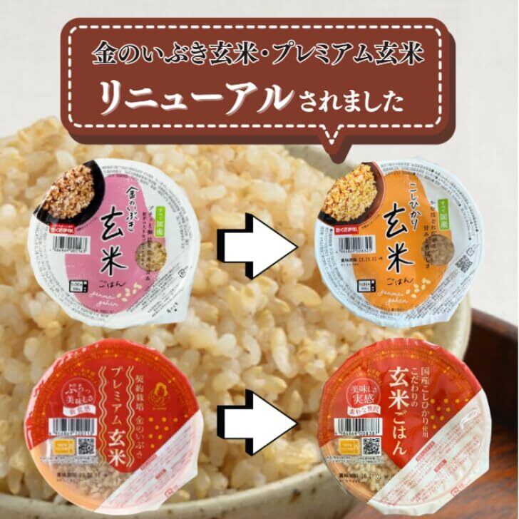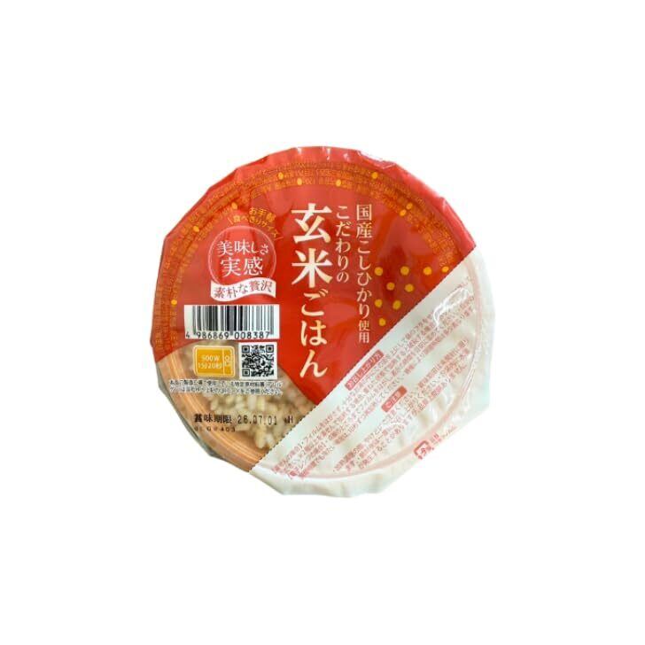 こだわりの玄米ごはん:栄養たっぷりの玄米をもっと気軽に楽しんでいただけるよう、120gのパックにしました。 国産こしひかりを使用し、もっちりとした粘りと甘みを感じられます。