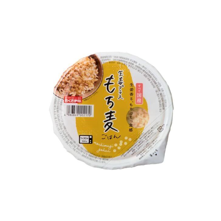 生姜プラスもち麦ごはん:国産刻み生姜香るもちぷち食感。機能成分β‐グルカンが従来の大麦より約1.5倍ある国産もち麦『キラリモチ』を使用。