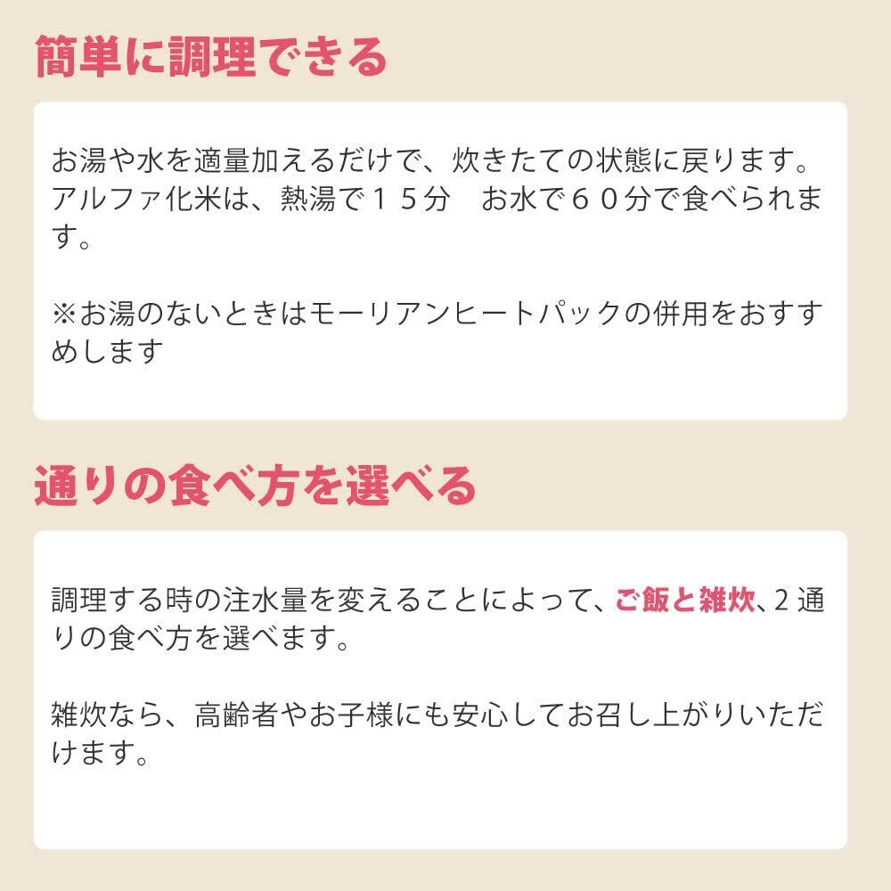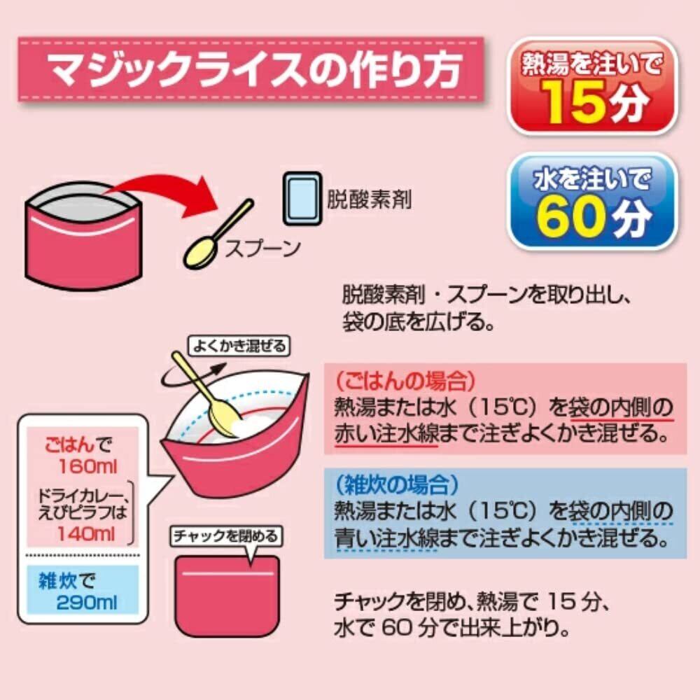 【マジックライス全9種類コンプリートセット】白飯・わかめご飯・青菜ご飯・梅じゃこご飯、 五目ご飯・ドライカレー・野菜ピラフ・根菜ご飯・チャーハン 国産うるち米使用!震災用の非常食・アウトドア・海外旅行に最適! ■マジックライスとは? 一度炊いたご飯を乾燥させているため、長期保存が可能です。お湯や水を適量加えることで、炊き立ての状態に戻ります。特殊な製法によって、粒感のあるおいしいごはんが出来上がります。 ■簡単に調理できるお湯や水を適量加えるだけで、炊きたての状態に戻ります。アルファ化米は、熱湯で15分 お水で60分で食べられます。 ※お湯のないときはモーリアンヒートパックの併用をおすすめします ■2通りの食べ方を選べる調理する時の注水量を変えることによって、ご飯と雑炊、2通りの食べ方を選べます。雑炊なら、高齢者の方にも安心してお召し上がりいただけます。 ■賞味期限:製造より5年保存(賞味期限4年半以上の商品をお届けします)