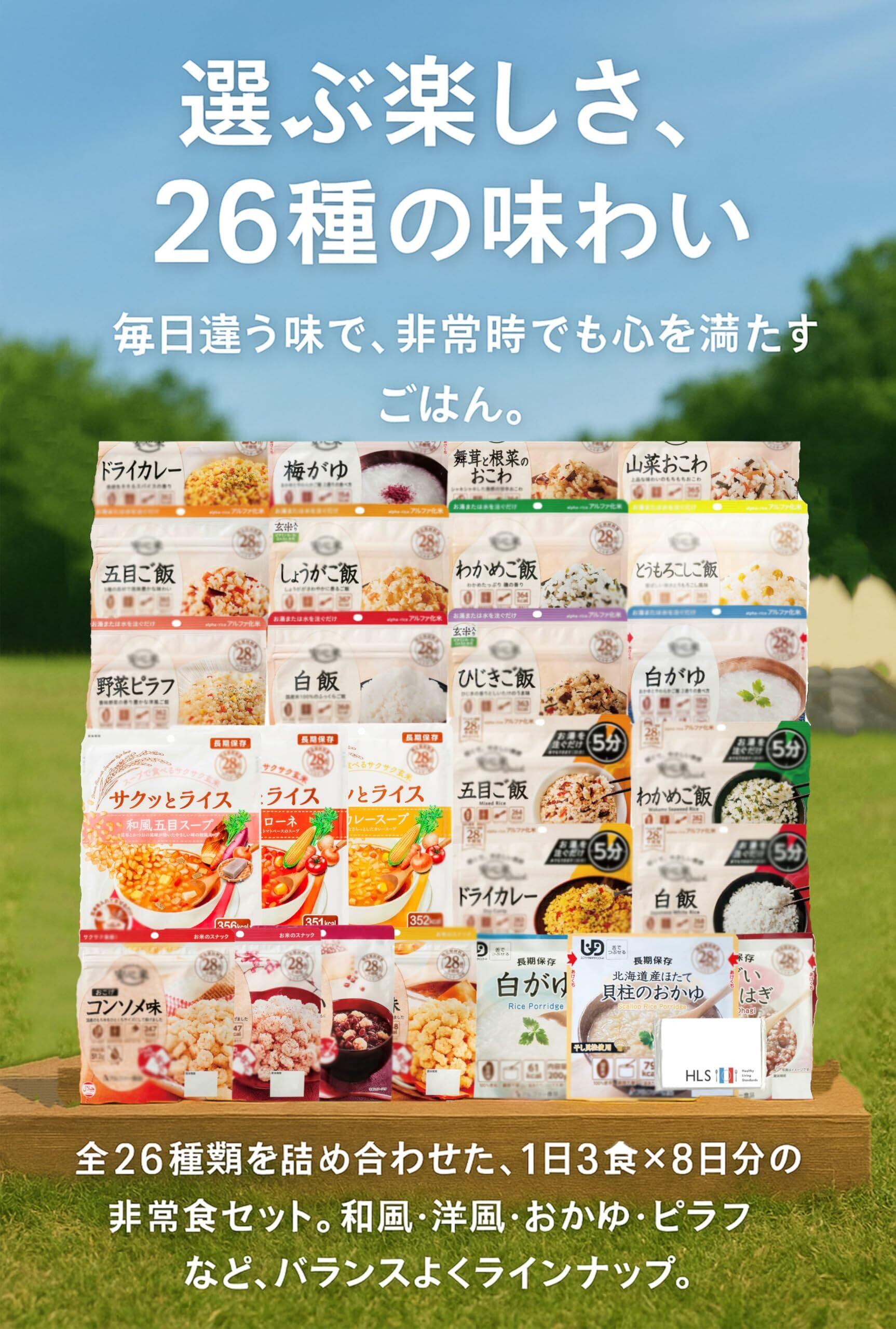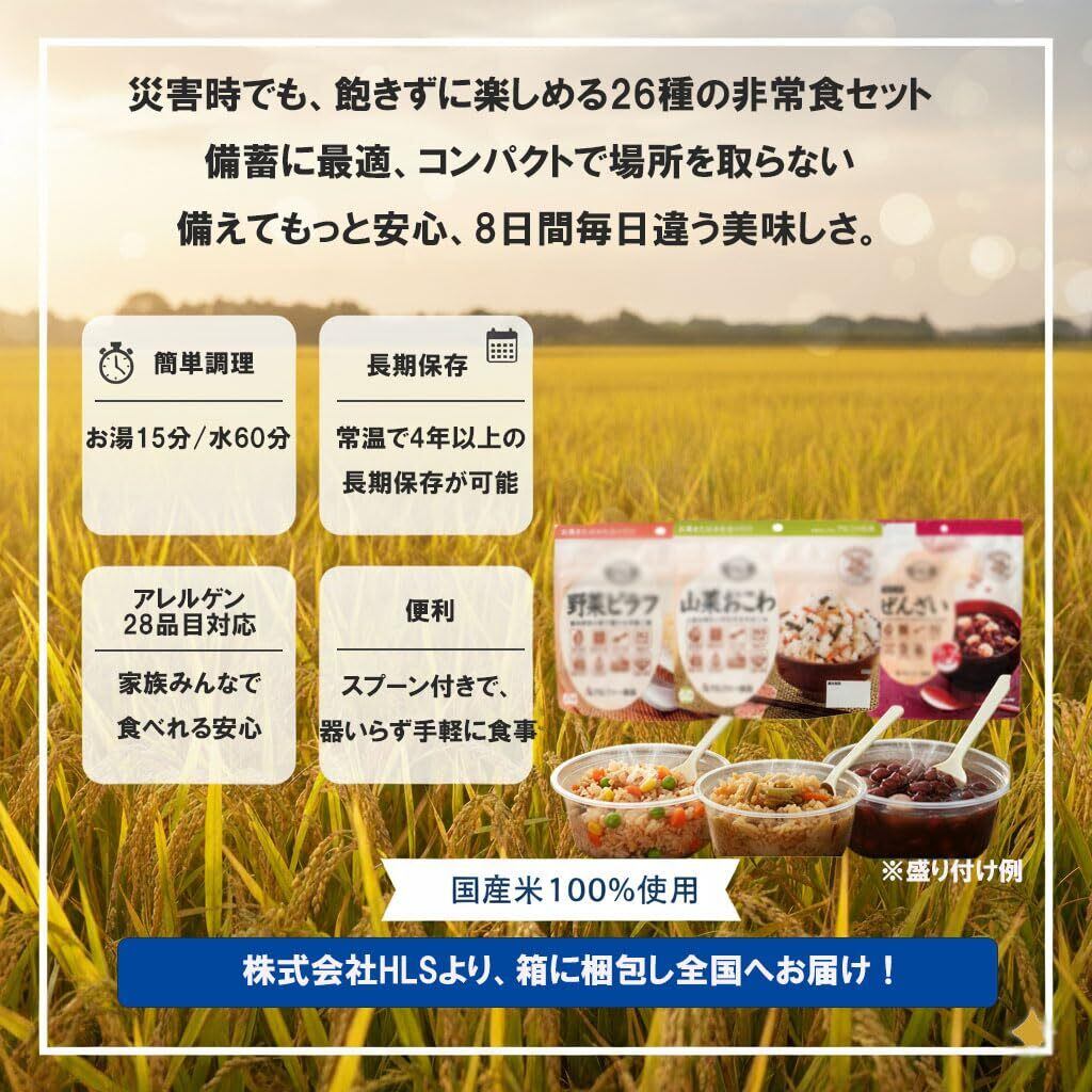 【HLS】 アルファ米 26種セット 非常食 5年 長期保存 保存食 国産米100%使用 国内製造 特定原材料28品目不使用 防災食品 備蓄品 HLS オリジナルポケットティッシュ付