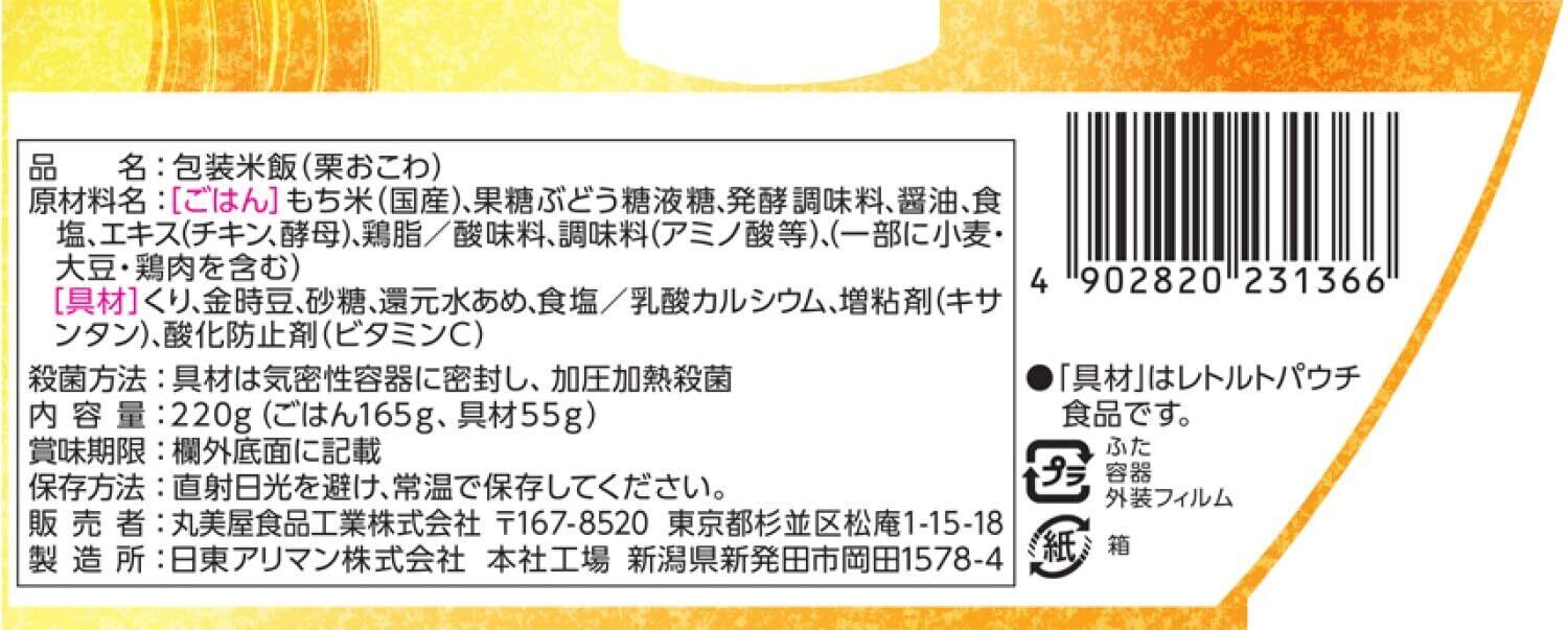 原材料:[ごはん]もち米(国産)、果糖ぶどう糖液糖、発酵調味料、醤油、食塩、エキス(チキン、酵母)、鶏脂/酸味料、調味料(アミノ酸等)、(一部に小麦・大豆・鶏肉を含む)|[具材]くり、金時豆、砂糖、還元水あめ、食塩/乳酸カルシウム、増粘剤(キサンタン)、酸化防止剤(ビタミンC)