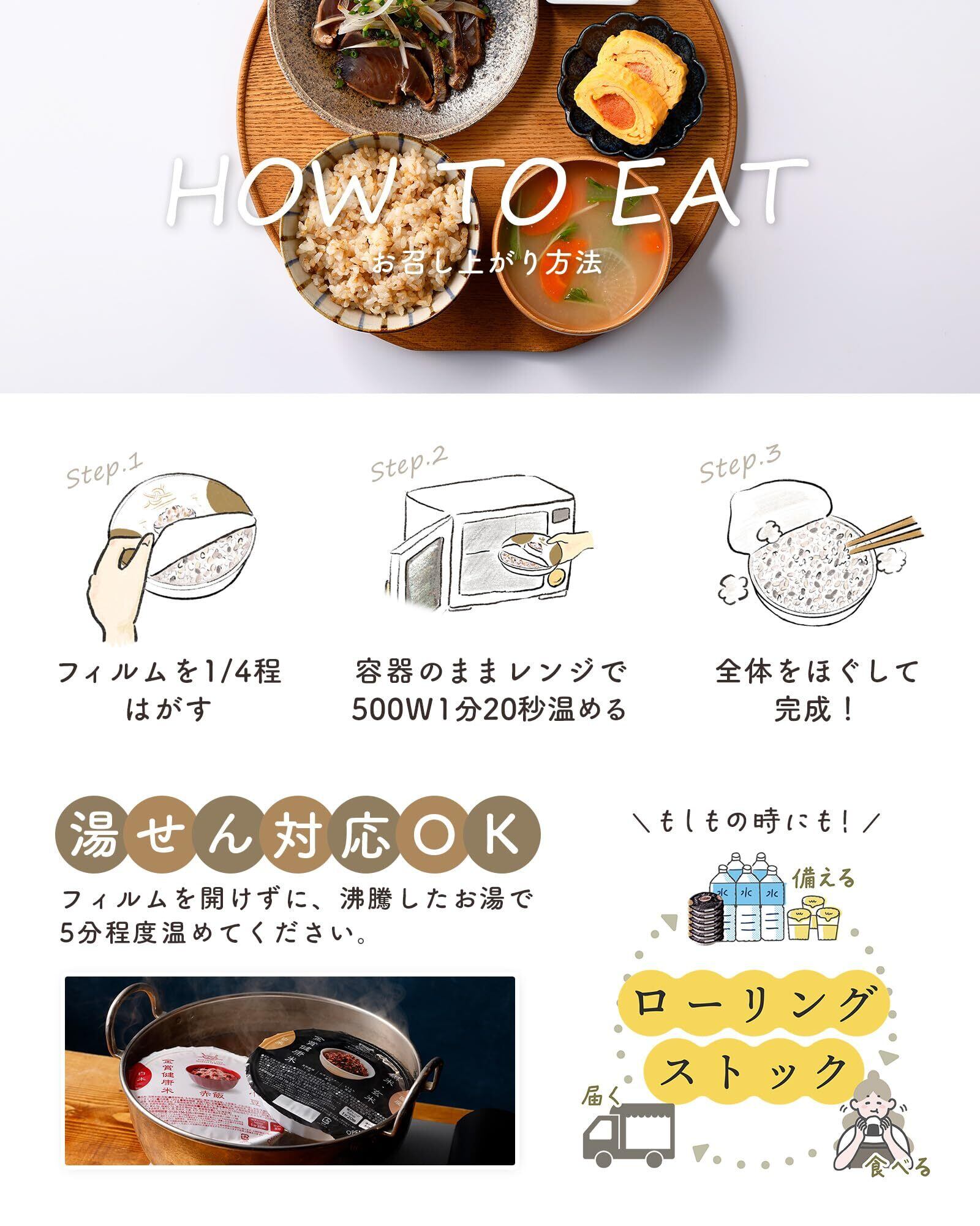 【独自製法×大学共同開発】近畿大学農学部と共同開発した独自の「ヘルスキープ製法」により、通常の白米に比べてビタミンEやビタミンB1の残存率が高いのが特徴。創業50年の米飯製造技術と徹底した品質管理で、ふっくら食感と香ばしい風味を実現しました。