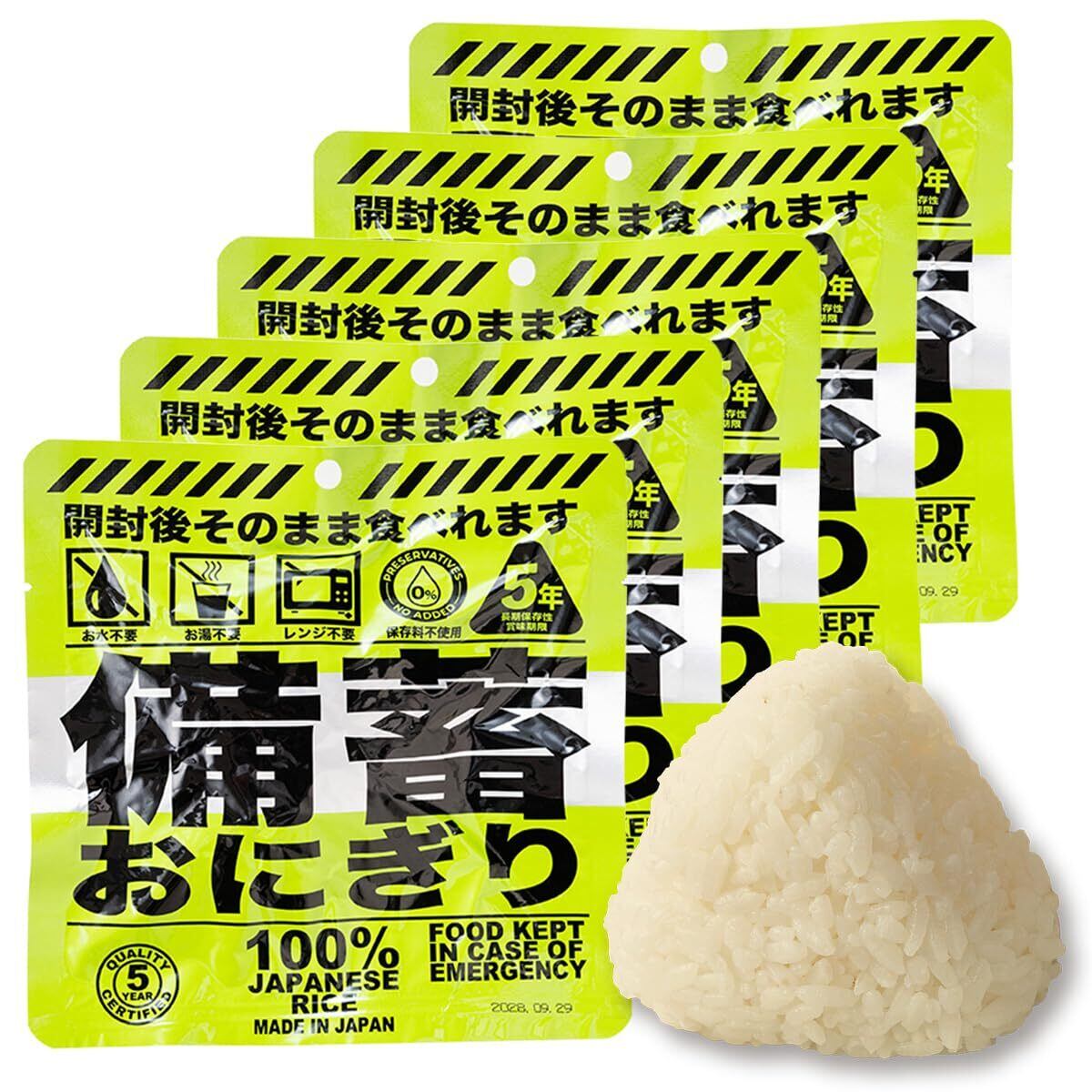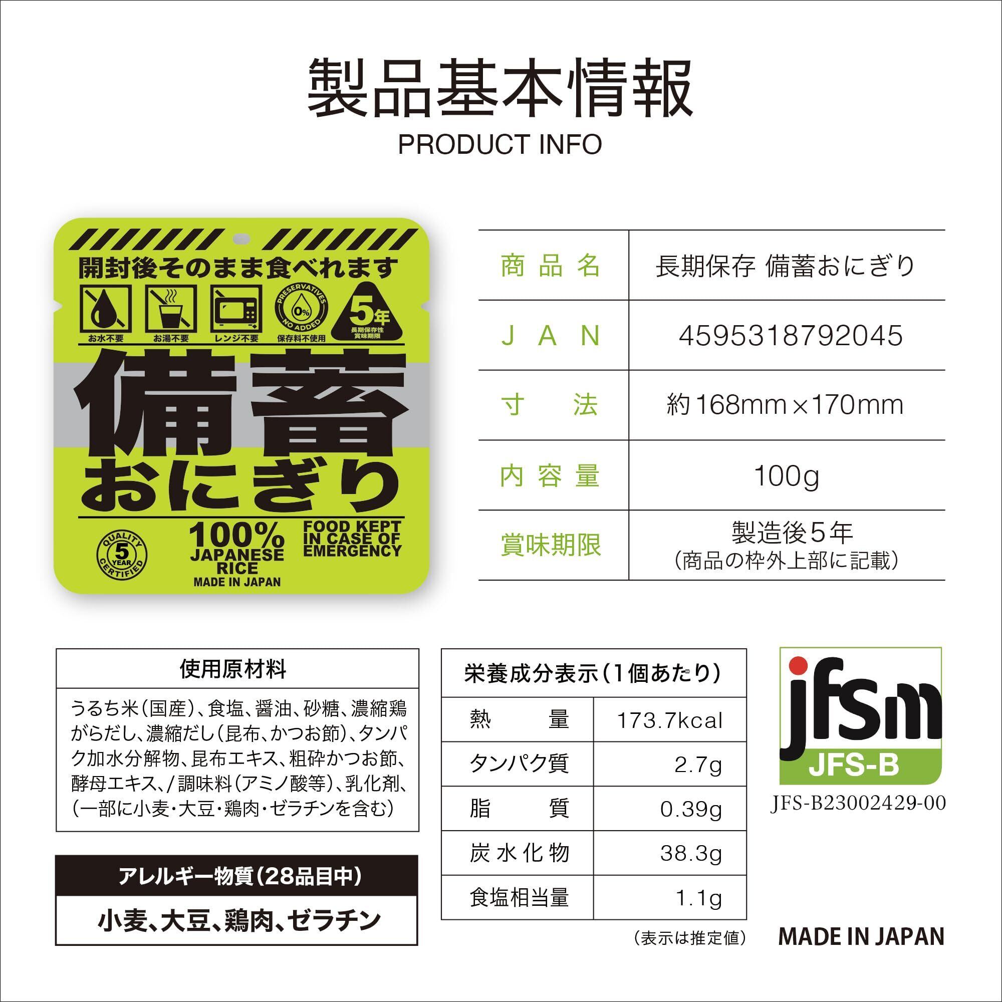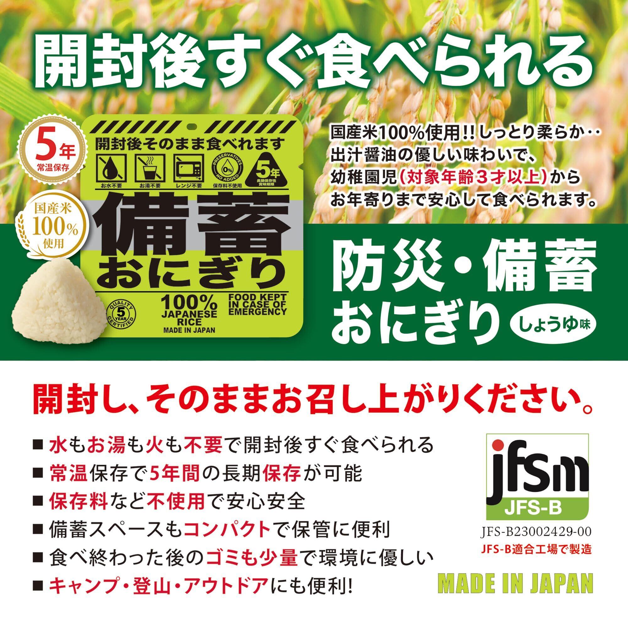 長期保存おにぎり「備蓄おにぎり」とは ・国産米100%使用 お米作りから取り組んでいます。常温保存で5年間の賞味期限を実現、長期保存が可能 ・水もお湯も火も不要で、袋から出してそのまま食べることができる。 ・備蓄スペースもコンパクトで保管に便利。 ・食べ終わったら後のゴミも少量で環境にやさしい。 ・しっとり柔らかで、幼稚園児(対象年齢3才以上)からお年寄りまで美味しく召し上がれます。 ・JFS-B適合の食品工場にて製造。・災害初期のインフラ崩壊時に威力を発揮します。