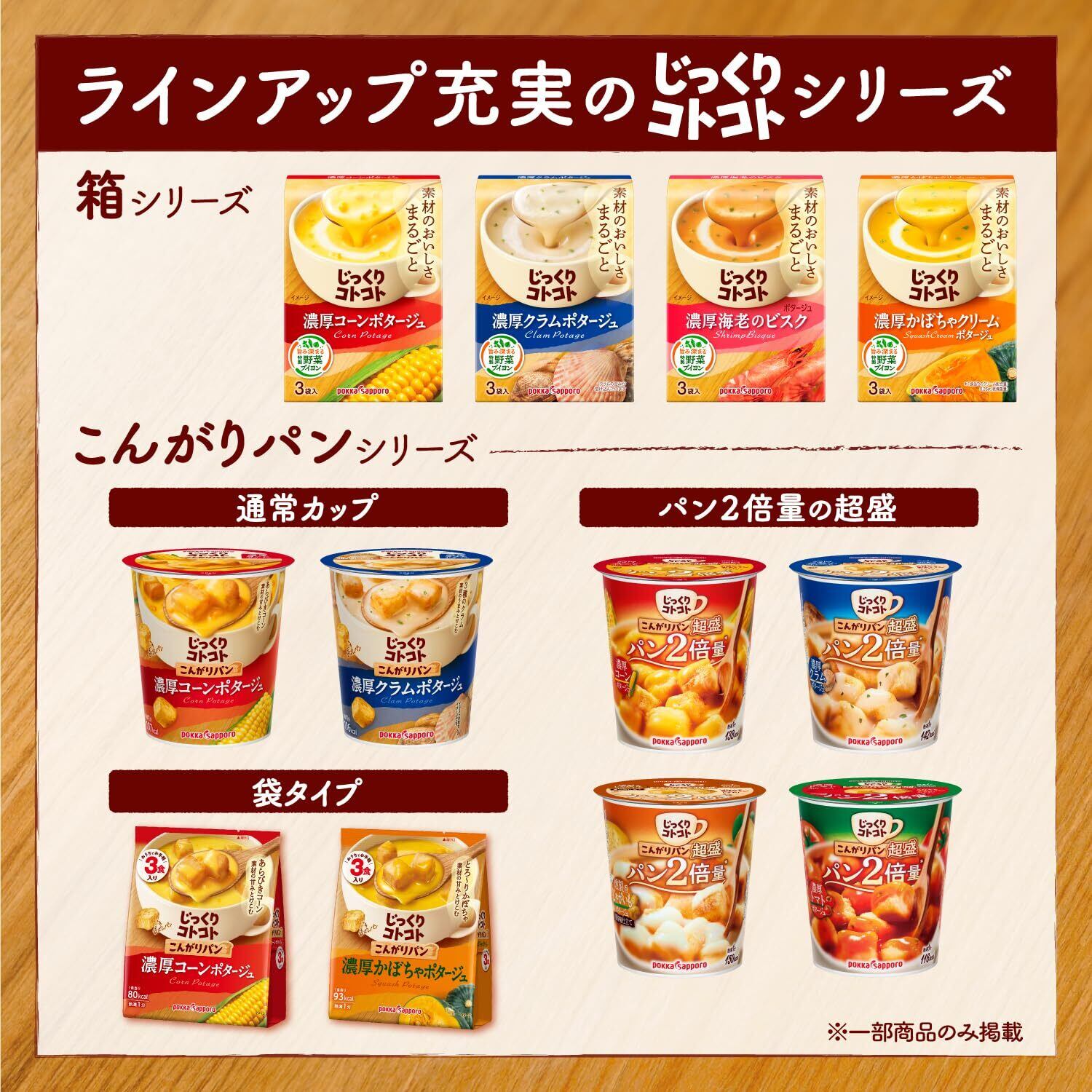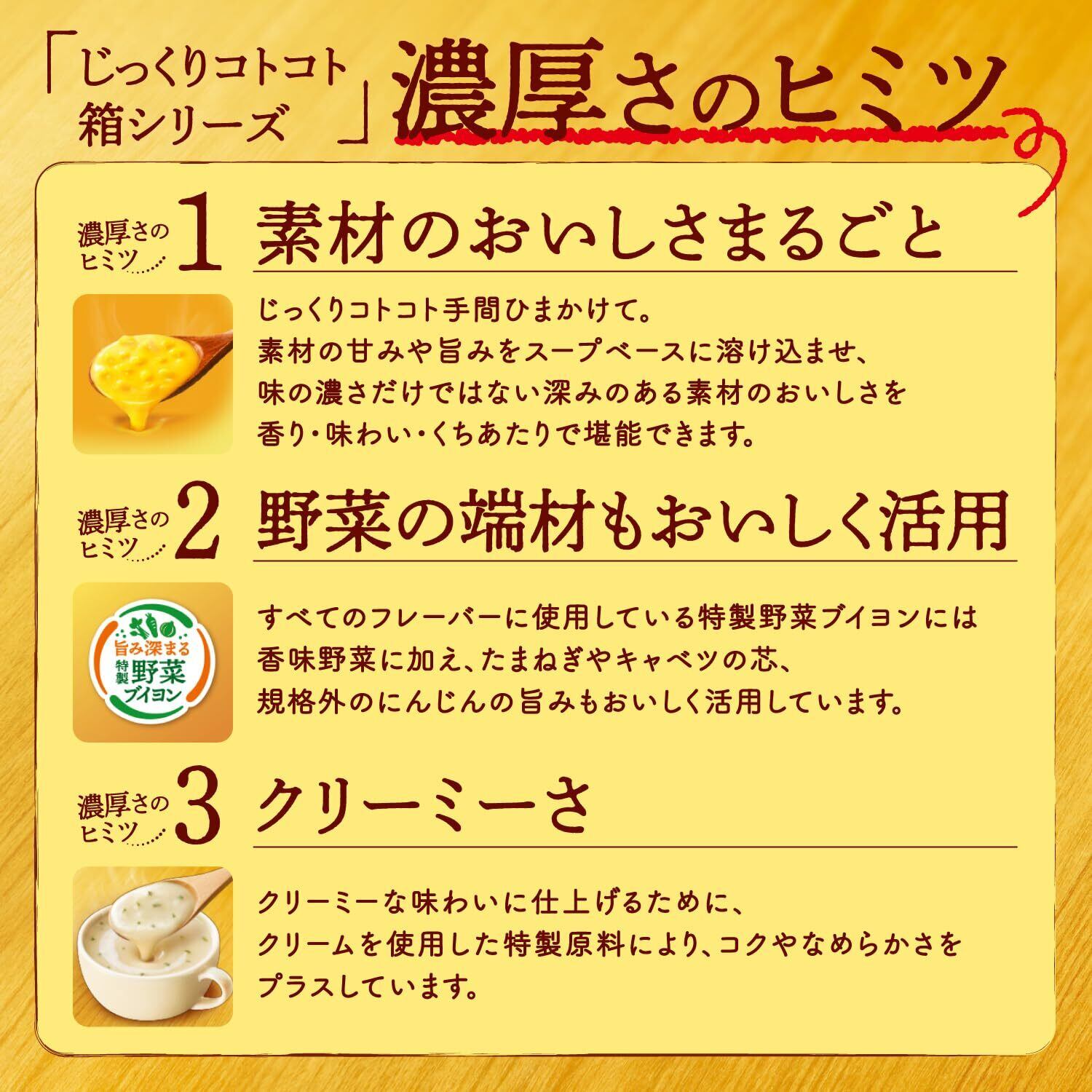 コーンがたっぷりとけこんだ、濃厚クリーミーなコーンポタージュです。上品な甘 みとなめらかなくちあたりで、素材のおいしさをまるごと味わえます。たまねぎや キャベツの芯も活用した特製野菜ブイヨンも濃厚さのヒミツ。
