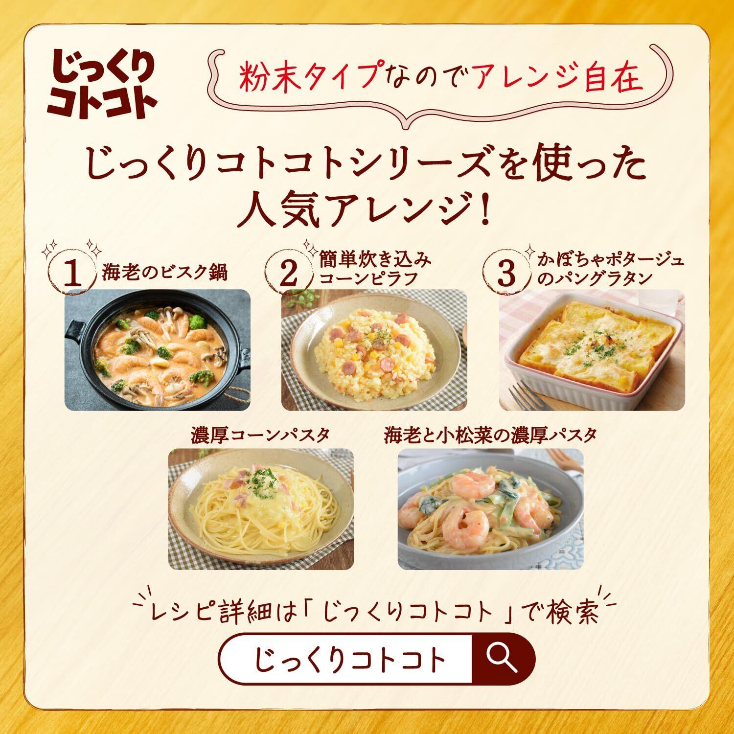 ●原材料:スイートコーンパウダー(ニュージーランド製造)、ホエイパ ウダー、乳糖、クリーム加工品(植物油脂、クリーム、乳糖、 乳たんぱく、その他)、砂糖、クリーミングパウダー、食塩、 野菜ブイヨン、チキンブイヨン、うきみ(乾燥スイートコーン )/増粘剤(加工でん粉)、加工でん粉、調味料(アミノ酸等 )、(一部に小麦・乳成分・大豆・鶏肉を含む)