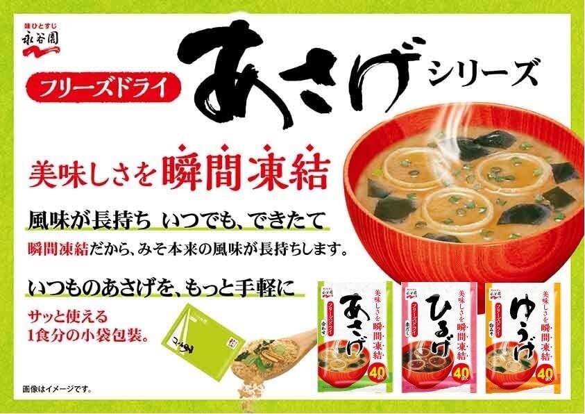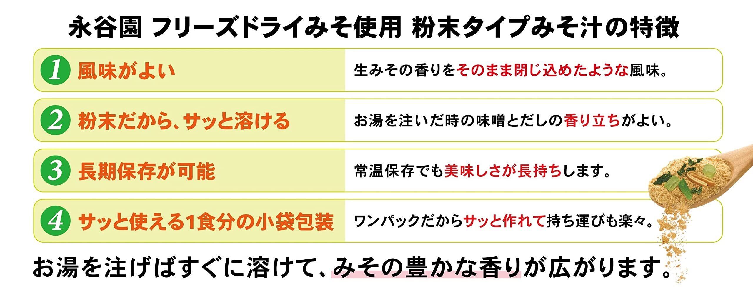 真空凍結乾燥(フリーズドライ)の味噌を使った粉末タイプのおみそ汁を3種類アソートにしました。「あさげ(合わせ)」16袋、「ひるげ(赤だし)」16袋、「ゆうげ(白みそ)」16袋の合計48袋入で、3種類の味が楽しめます。