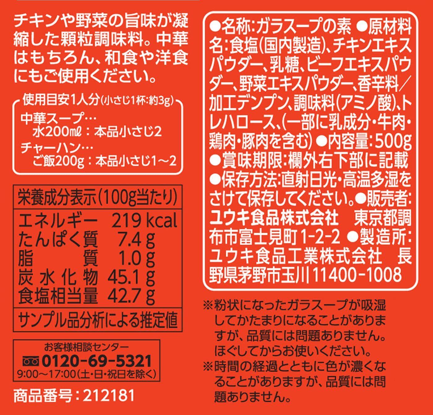 原材料:食塩(国内製造)、チキンエキスパウダー、乳糖、ビーフエキスパウダー、野菜エキスパウダー、香辛料/加工デンプン、調味料(アミノ酸)、トレハロース、(一部に乳成分・牛肉・鶏肉・豚肉を含む)