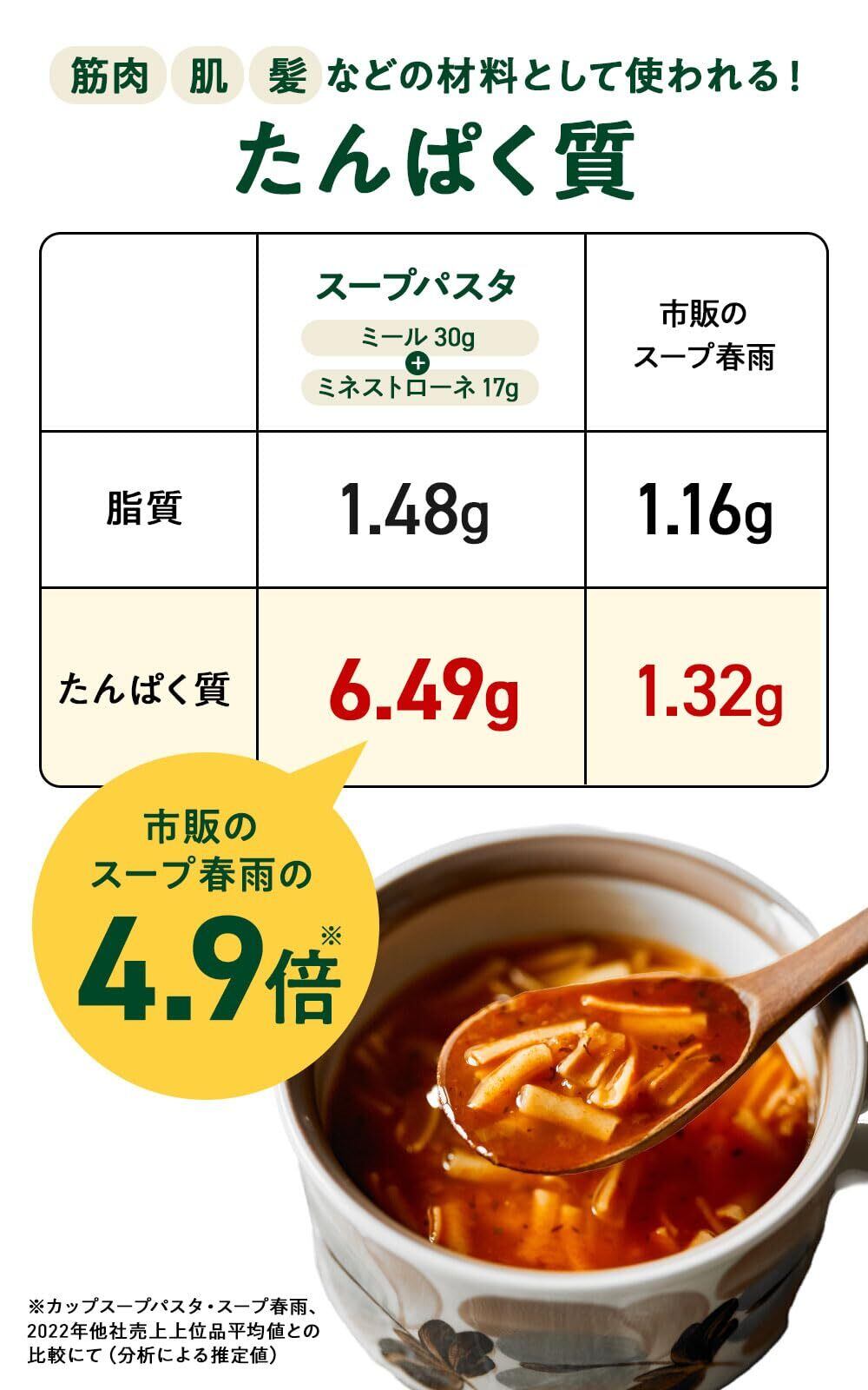 【いつものスープよりたんぱく質4.9倍】市販の春雨スープよりも たんぱく質 (プロテイン) 4.9倍、食物繊維 8.0倍、塩分20%OFF*6。*6カップスープパスタ・スープ春雨、2022年 他社売上上位品平均値との比較にて(分析値による推定値)、喫食時1食あたりの値は、ZENBミール乾物30g(戻し後100g)+ZENBミールスープベース1袋