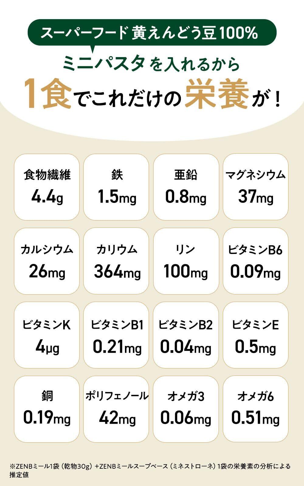 【栄養がとれる1食】1食で、たんぱく質6.4g、食物繊維 4.6g、鉄1.5㎎、亜鉛 0.834㎎、マグネシウム 37㎎、カルシウム 26㎎、カリウム364㎎、ビタミンB6 0.09㎎、ビタミンK 4μg、ビタミンB1 0.21㎎、ビタミンB2 0.04㎎、ビタミンB4 0.5㎎、銅 0.91㎎、ポリフェノール42㎎、オメガ3 0.06㎎、オメガ6 0.51㎎*4。 *5 ZENBミール1袋(乾物30g)+ZENBミールスープベース(ミネストローネ)1袋の栄養素の分析による推定値