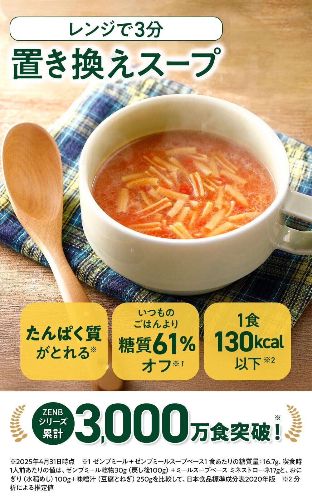 【置き換えスープ】ファスティングではなく、ダイエットをするなら食べたいを我慢したくない方に。1食140kcal以下、いつもの朝ごはんより糖質61%OFF*3、市販スープ春雨よりも食物繊維8倍*4。 *おにぎり100g、味噌汁250gとZENBミール乾物30g(戻し後100g)+ミールスープベース ミネストローネ17gと比較して *1 2022年他社売上上位品平均値との比較にて(分析値による推定値)、喫食時1食あたり日本食品標準成分表2020年版、分析による推定値、ZENBミール+ZENBミールスープベース 1食あたりの糖質量:16.7g