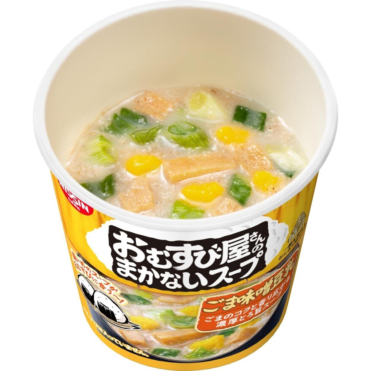 「おむすび屋さんのまかないスープ ごま味噌豆乳」は、まろやかな豆乳スープに香ばしいごまの香りと味噌のコクを加えた "とろ旨" な味わいです。