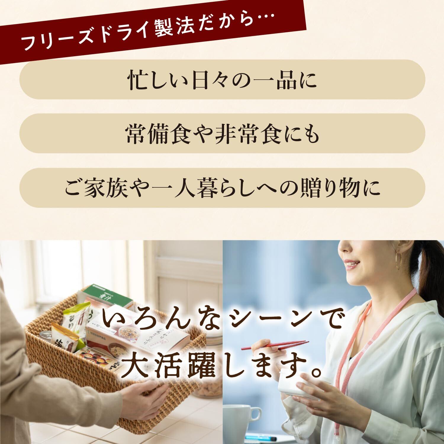 【素材のこだわり】海鮮おみそ汁は素材にもこだわりました。「紅ずわいがに」は、冷水塊と暖流域との境界部にあたる有数の好漁場で漁獲。水揚げした原料は市場を通さずに直接向上に運び、新鮮なうちに人の手で丁寧に加工して美味しさをいかしてます。旨みたっぷりの海鮮おみそ汁をお楽しみください。