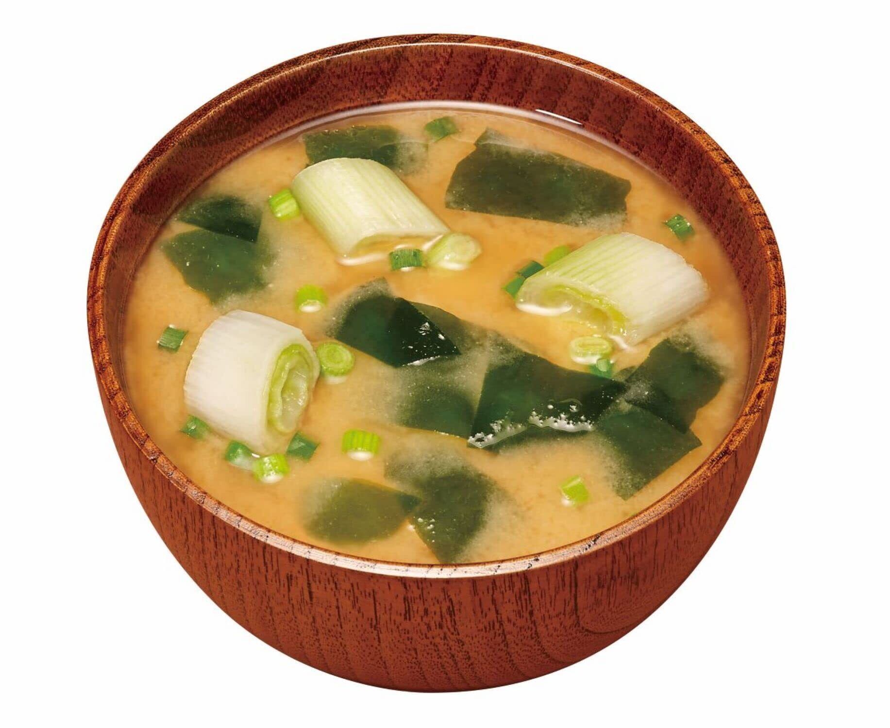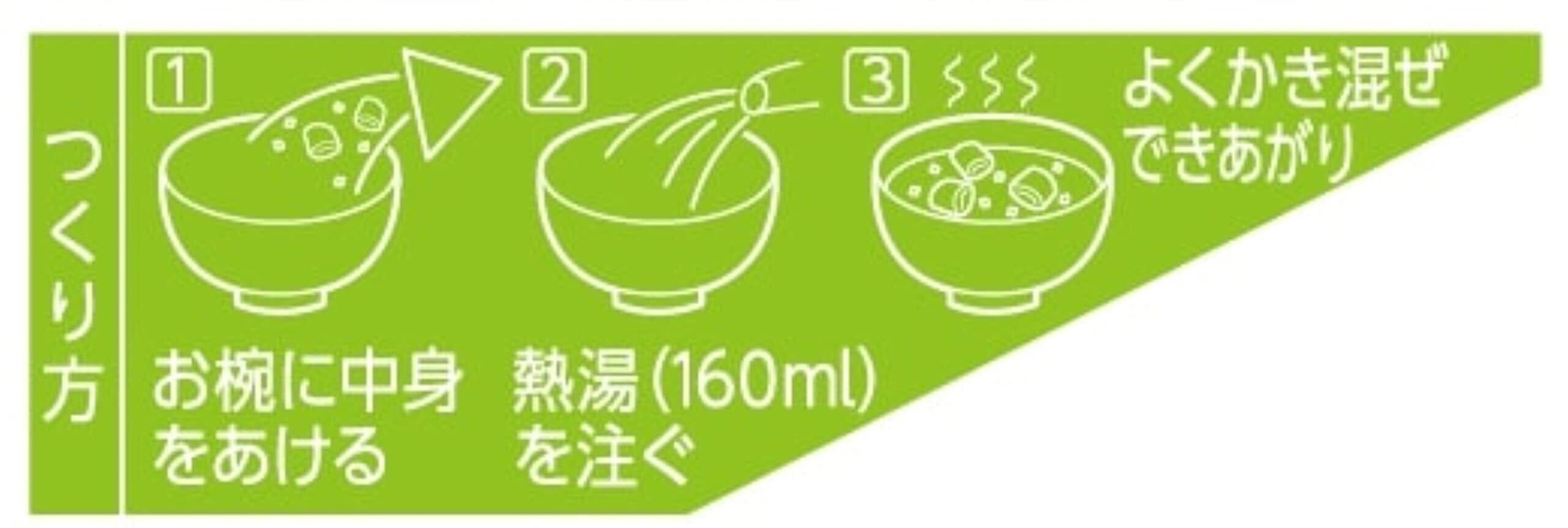 原材料:米みそ、ねぎ、わかめ、デキストリン、ぶどう糖、豆みそ、かつおぶし粉末、発酵調味料、食塩、たん白加水分解物、こんぶ粉末、酵母エキス、かつおぶしエキス、さばぶし粉末、調味料(アミノ酸等)、増粘多糖類、<原材料の一部に小麦を含む>