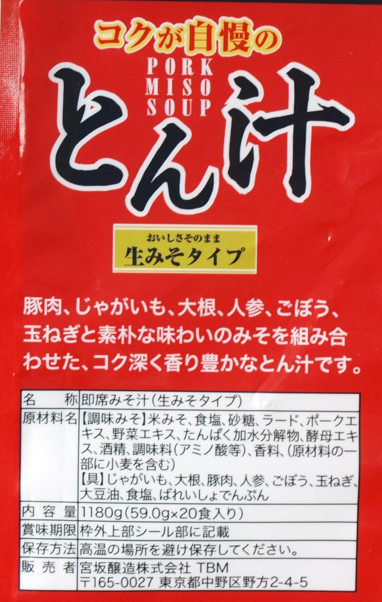・宮坂醸造 神州一味噌 コクが自慢のとん汁 1180g(59g×20食入り)<BR>・食卓に、おいしさと感動を! 神州一味噌 創業1662年・宮坂醸造<BR>・コクが自慢の PORK MISO SOUP とん汁<BR>・おいしさそのまま 生みそタイプ<BR>・20食 たっぷり具が楽しめる。とん汁 生タイプの具<BR>