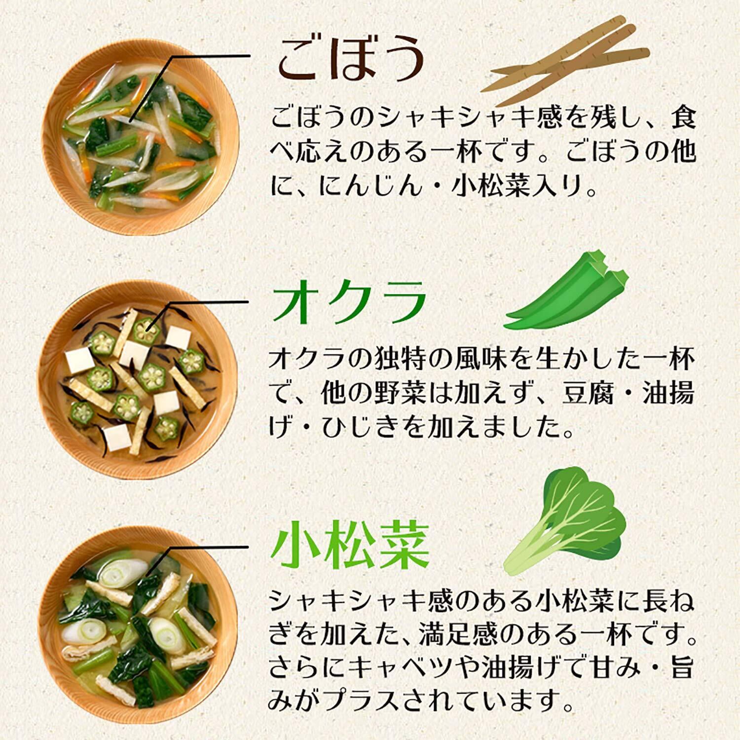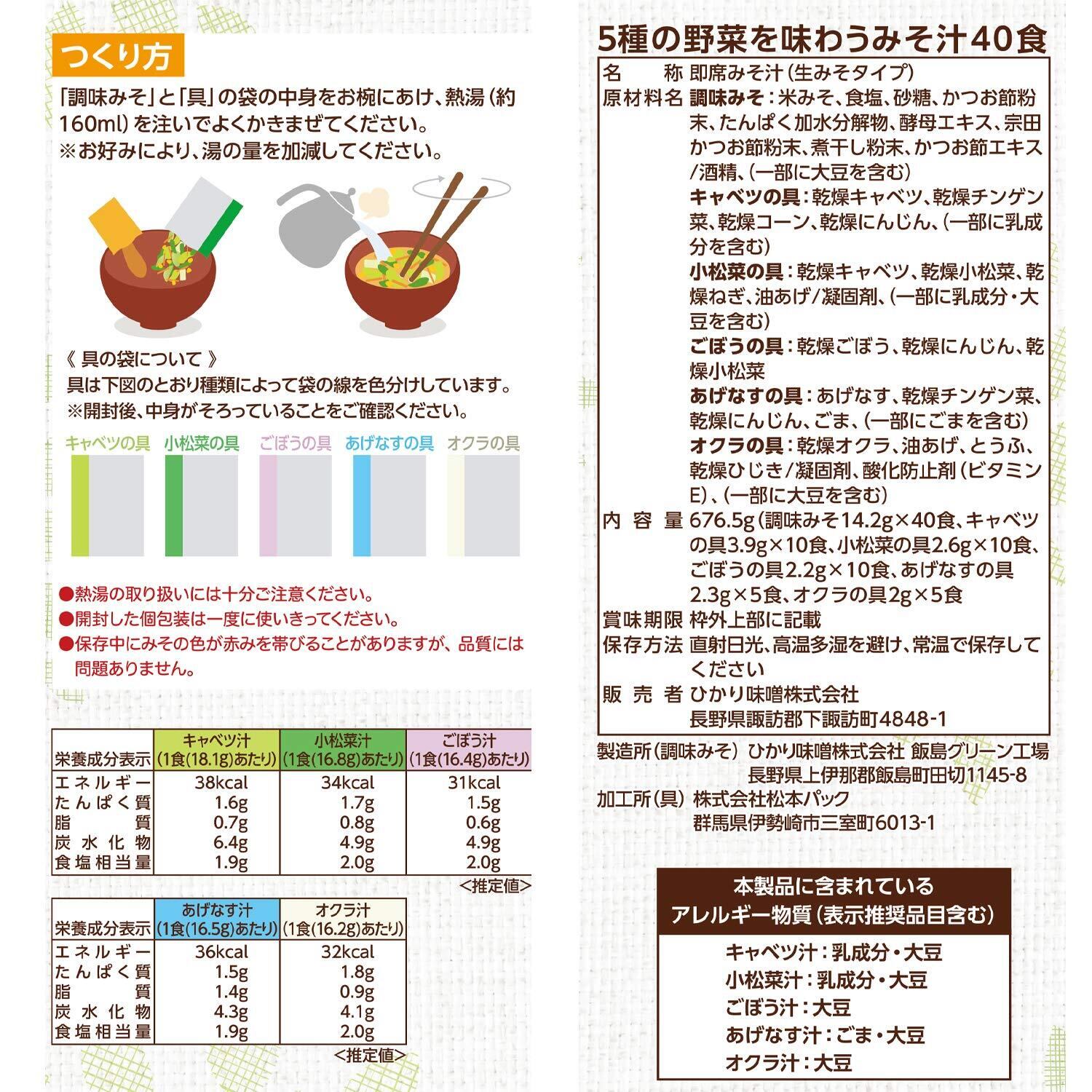 名称:即席みそ汁(生みそタイプ) 原材料名:調味みそ:米みそ(国内製造)、食塩、砂糖、かつお節粉末、たんぱく加水分解物、酵母エキス、宗田かつお節粉末、煮干し粉末、かつお節エキス/酒精、(一部に大豆を含む) キャベツの具:乾燥キャベツ、乾燥チンゲン菜、乾燥コーン、乾燥にんじん、(一部に乳成分を含む) 小松菜の具:乾燥小松菜、乾燥キャベツ、乾燥ねぎ、油揚げ/凝固剤、(一部に乳成分、大豆を含む) ごぼうの具:乾燥ごぼう、乾燥にんじん、乾燥小松菜 あげなすの具:あげなす、乾燥チンゲン菜、乾燥にんじん、ごま、(一部にごまを含む) オクラの具:乾燥オクラ、油あげ、とうふ、乾燥ひじき/凝固剤、酸化防止剤、(一部に大豆を含む)