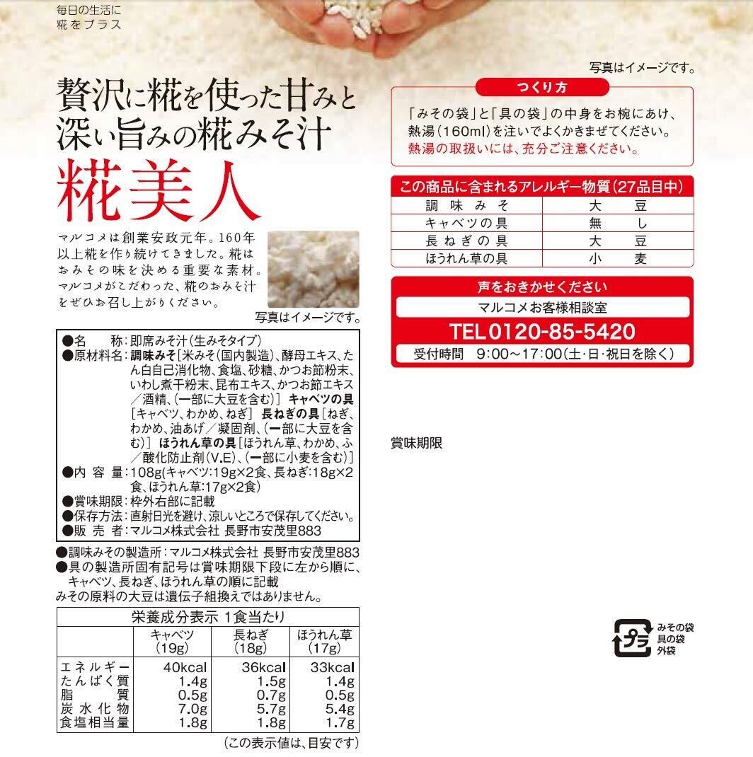【原材料】調味みそ[米みそ、酵母エキス、たん白自己消化物、食塩、砂糖、かつお節粉末、いわし煮干粉末、かつお節エキス、昆布エキス、酒精] 具[キャベツ<キャベツ(キャベツ、ぶどう糖)、わかめ、ねぎ>、 長ねぎ<ねぎ、わかめ、油あげ、凝固剤>、 ほうれん草<ほうれん草、わかめ、ふ(小麦を含む)、ソルビトール、酸化防止剤(V.E)>]