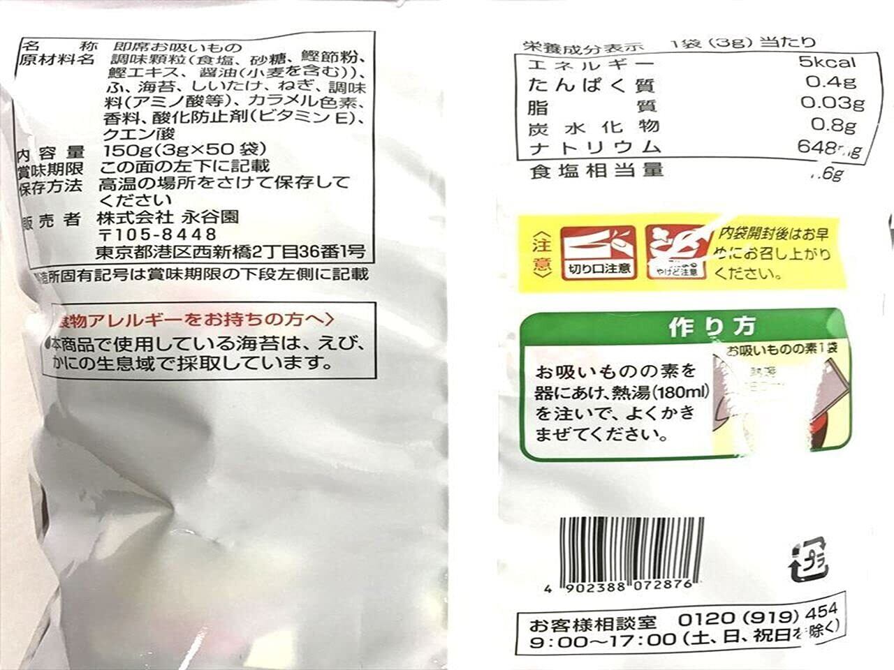 原材料:調味顆粒(食塩、砂糖、鰹節粉、鰹エキス、醤油(小麦を含む)、ふ、海苔、しいたけ、ねぎ、調味料(アミノ酸等)、カラメル色素、香料、酸化防止剤(ビタミンE)、クエン酸