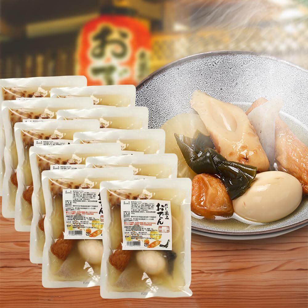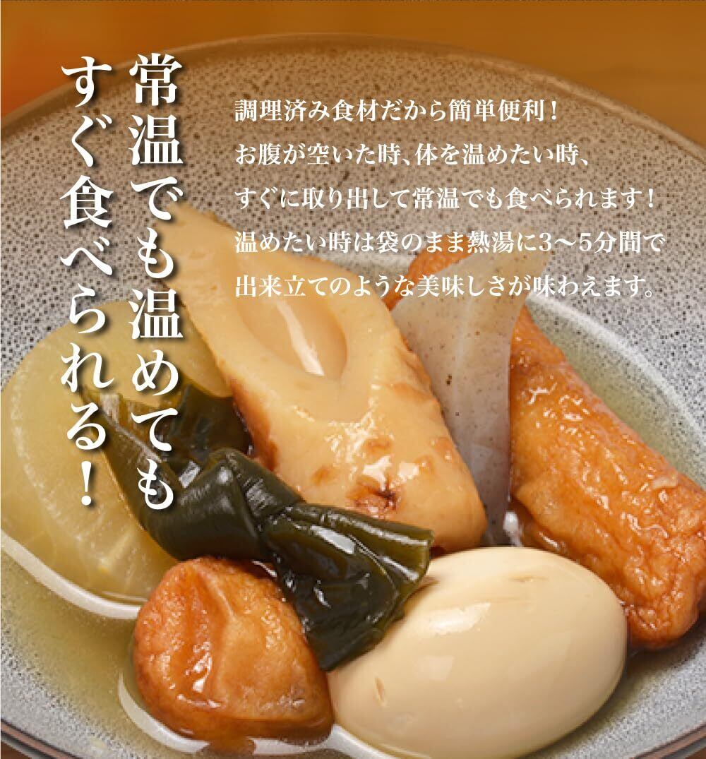 大根(国産)、玉子、ごぼう巻き、こんにゃく、竹輪、揚げボール、醤油、発酵調味料、昆布、水飴、砂糖、食塩、魚介エキス(昆布、かつお節、ほたて、いりこ)酵母エキス/水酸化Ca(一部に卵、小麦、大豆を含む)