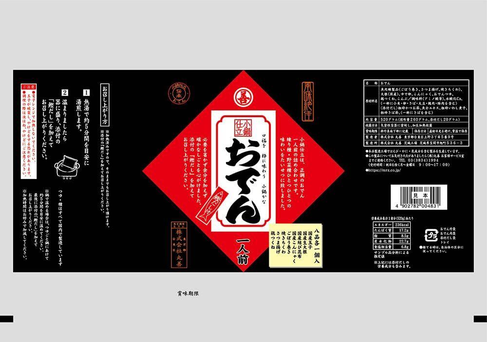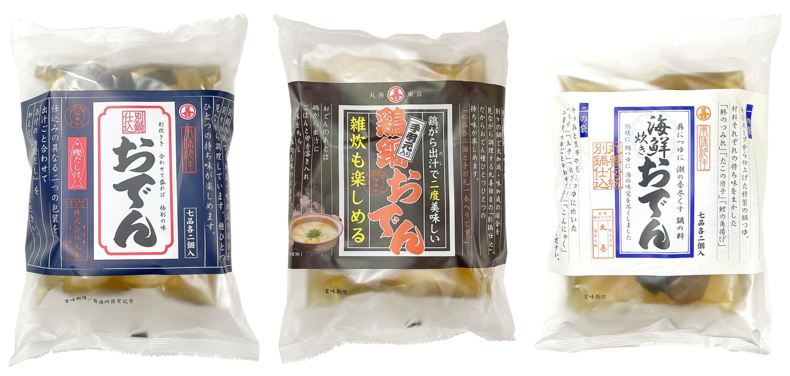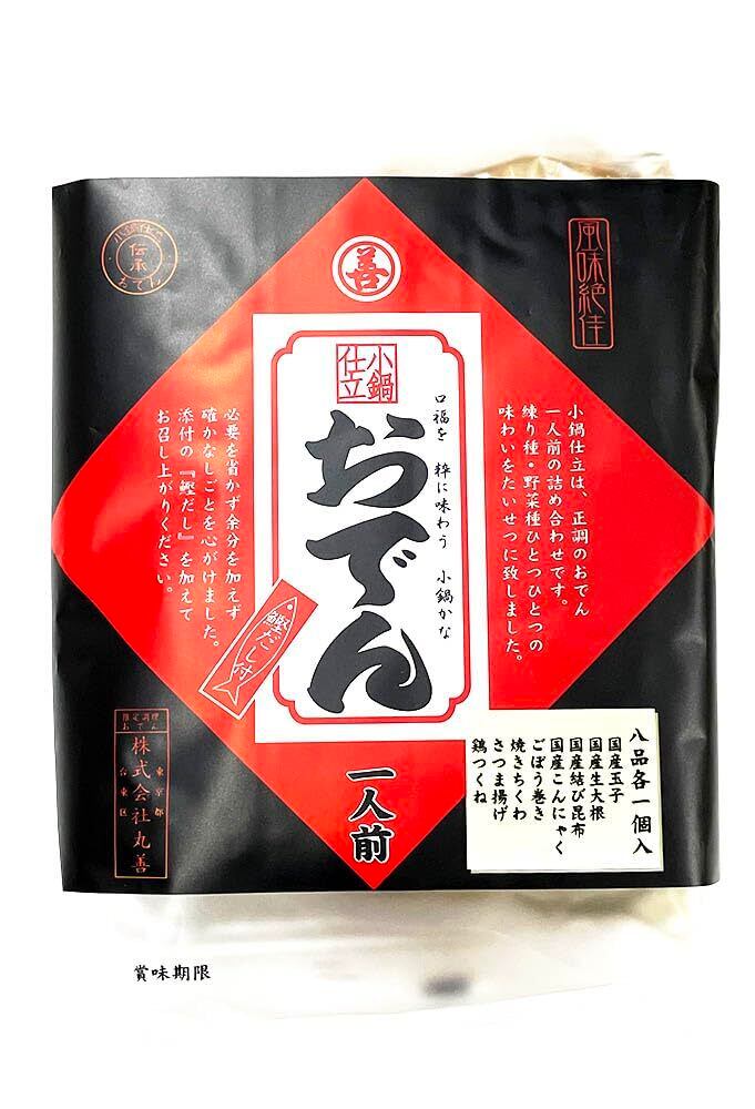 原材料:魚肉練製品(ごぼう巻、さつま揚、ちくわ)、大根、ゆで卵、こんにゃく、おでんつゆ[食塩、しょうゆ、砂糖、粗砕かつお節、粉砕混合節(さば節、いわし煮干)、こんぶエキス、こんぶ]、鶏つくね、こんぶ、調味料(アミノ酸等)、水酸化カルシウム、(原材料の一部に小麦、豚肉を含む)<添付だし>粗砕かつお節、魚介エキス、いわし煮干、さば節