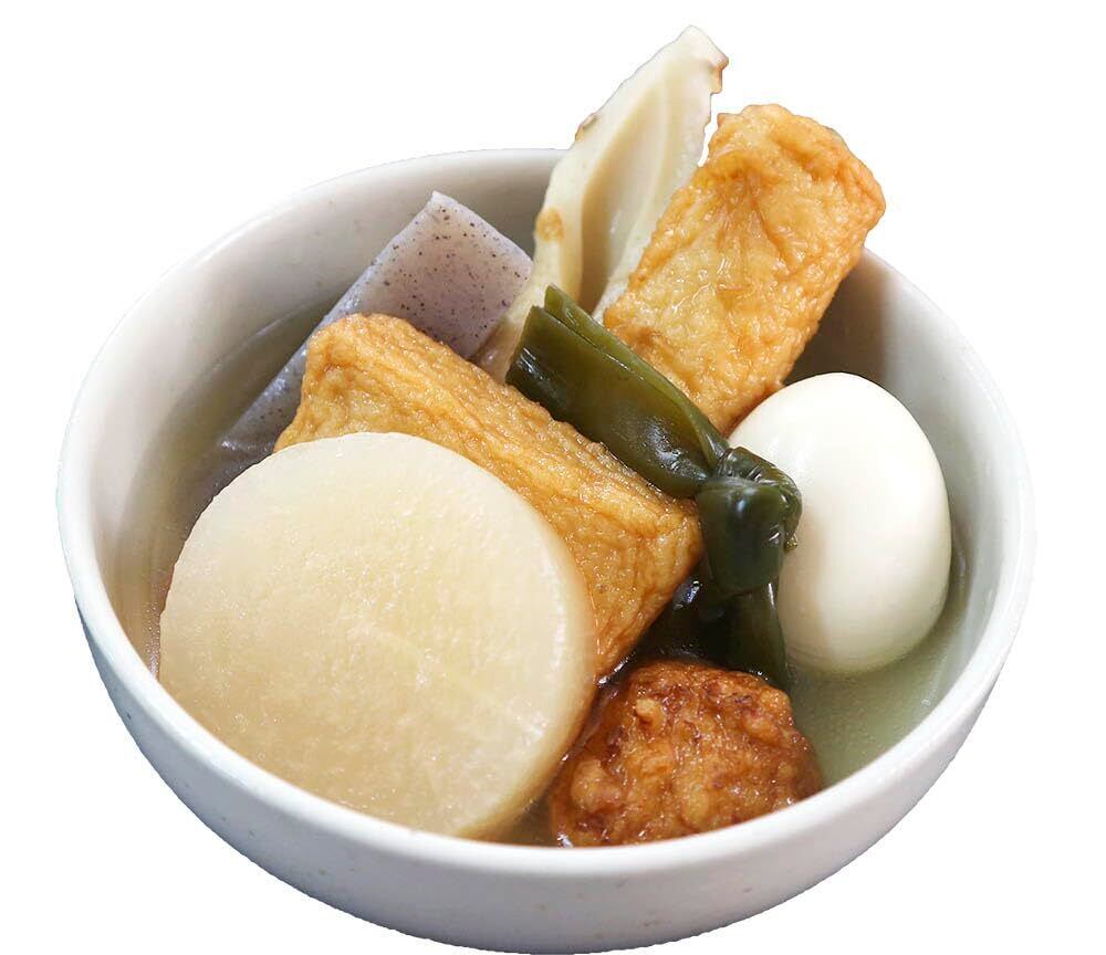 国産玉子・国産生大根・釧路産昆布・こんにゃく・ごぼう巻・竹輪・さつま揚・鶏つくねの八品が入っております。