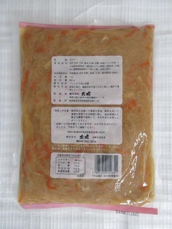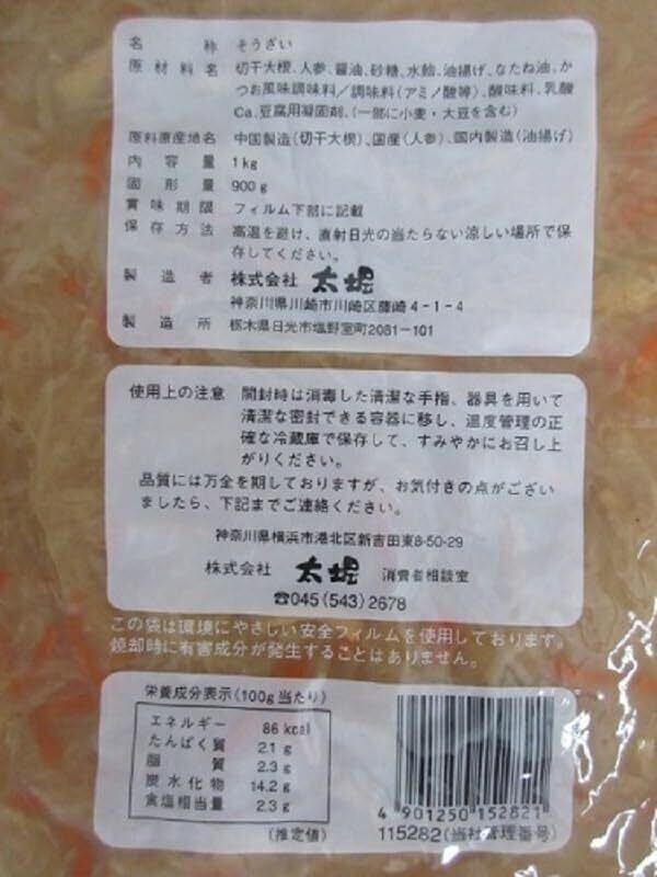 原材料:切干大根、人参、醤油、砂糖、水飴、油揚げ、なたね油、かつお風味調味料/調味料(アミノ酸等)、酸味料、乳酸Ca、豆腐用凝固剤、 (一部に小麦・大豆を含む)