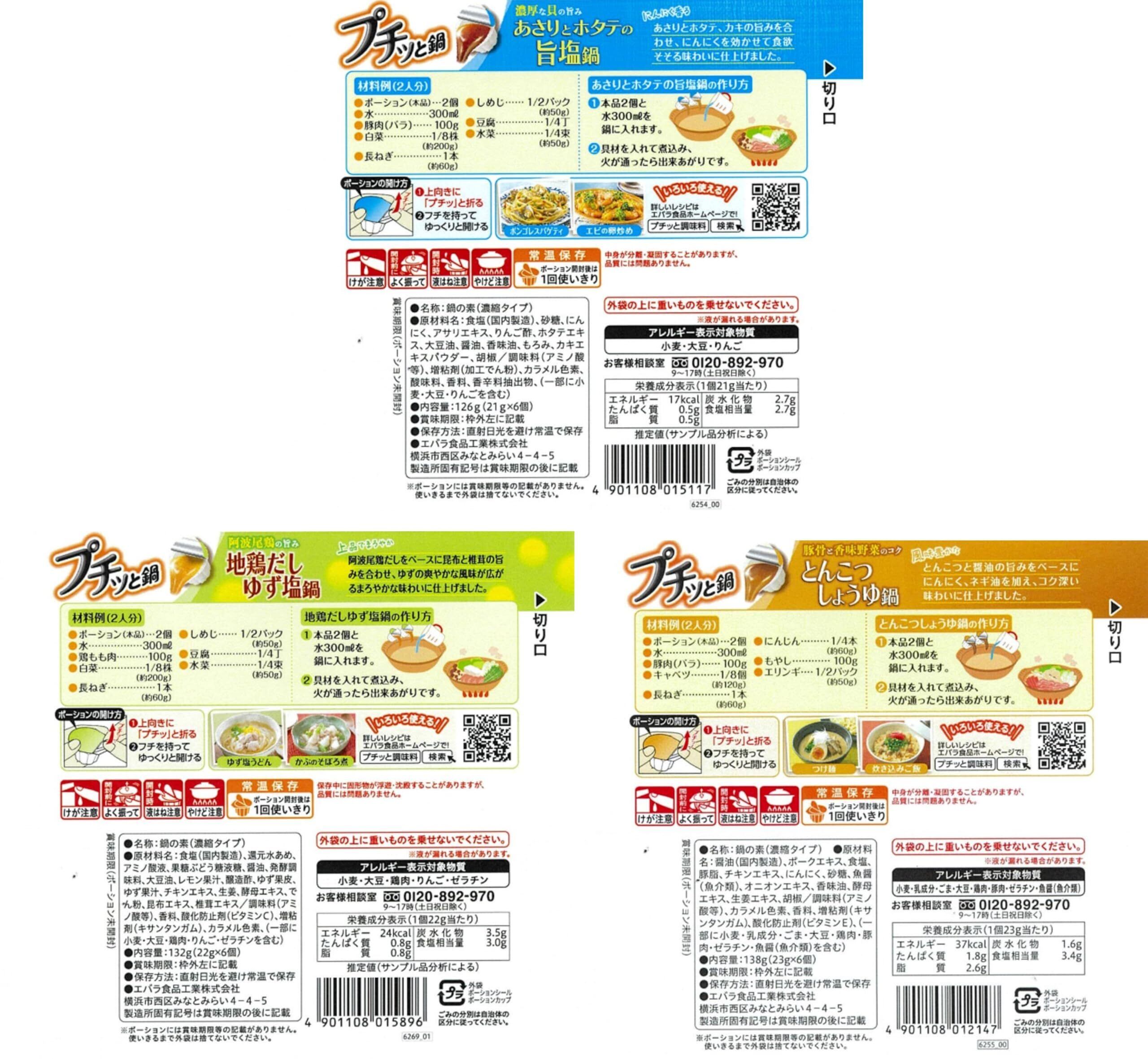 【プチッと鍋とんこつしょうゆ鍋】醤油(国内製造)、ポークエキス、食塩、豚脂、チキンエキス、にんにく、砂糖、魚醤(魚介類)、オニオンエキス、香味油、酵母エキス、生姜エキス、胡椒/調味料(アミノ酸等)、カラメル色素、香料、増粘剤(キサンタンガム)、酸化防止剤(ビタミンE)、(一部に小麦・乳成分・ごま・大豆・鶏肉・豚肉・ゼラチン・魚醤(魚介類)を含む)【プチッと鍋 あさりとホタテの旨塩鍋】食塩(国内製造)、砂糖、にんにく、アサリエキス、りんご酢、ホタテエキス、大豆油、醤油、香味油、もろみ、カキエキスパウダー、胡椒/調味料(アミノ酸等)、増粘剤(加工でん粉)、カラメル色素、酸味料、香料、香辛料抽出物、(一部に小麦・大豆・りんごを含む)【プチッと鍋 地鶏だしゆず塩鍋】食塩(国内製造)、還元水あめ、アミノ酸液、果糖ぶどう糖液糖、醤油、発酵調味料、大豆油、レモン果汁、醸造酢、ゆず果皮、ゆず果汁、チキンエキス、生姜、酵母エキス、でん粉、昆布エキス、椎茸エキス/調味料(アミノ酸等)、香料、酸化防止剤(ビタミンC)、増粘剤(キサンタンガム)、カラメル色素、(一部に小麦・大豆・鶏肉・りんご・ゼラチンを含む)【プチッと鍋 濃厚みそ鍋】みそ(国内製造)、醤油、大豆油、砂糖、ごま油、にんにく、ポークエキス、食塩、ラード、豆板醤、香味油、生姜、香辛料、ねぎ/調味料(アミノ酸等)、カラメル色素、酸化防止剤(ビタミンE)、(一部に小麦・ごま・大豆・豚肉を含む)【プチッと鍋 豆乳ごま鍋】豆乳(国内製造)、砂糖、食塩、ねりごま、みそ、アミノ酸液、醤油、ごま油、白ごま、ポークエキス、酵母エキス/調味料(アミノ酸)、乳化剤、増粘剤(キサンタンガム)、(一部に小麦・ごま・大豆・豚肉を含む)