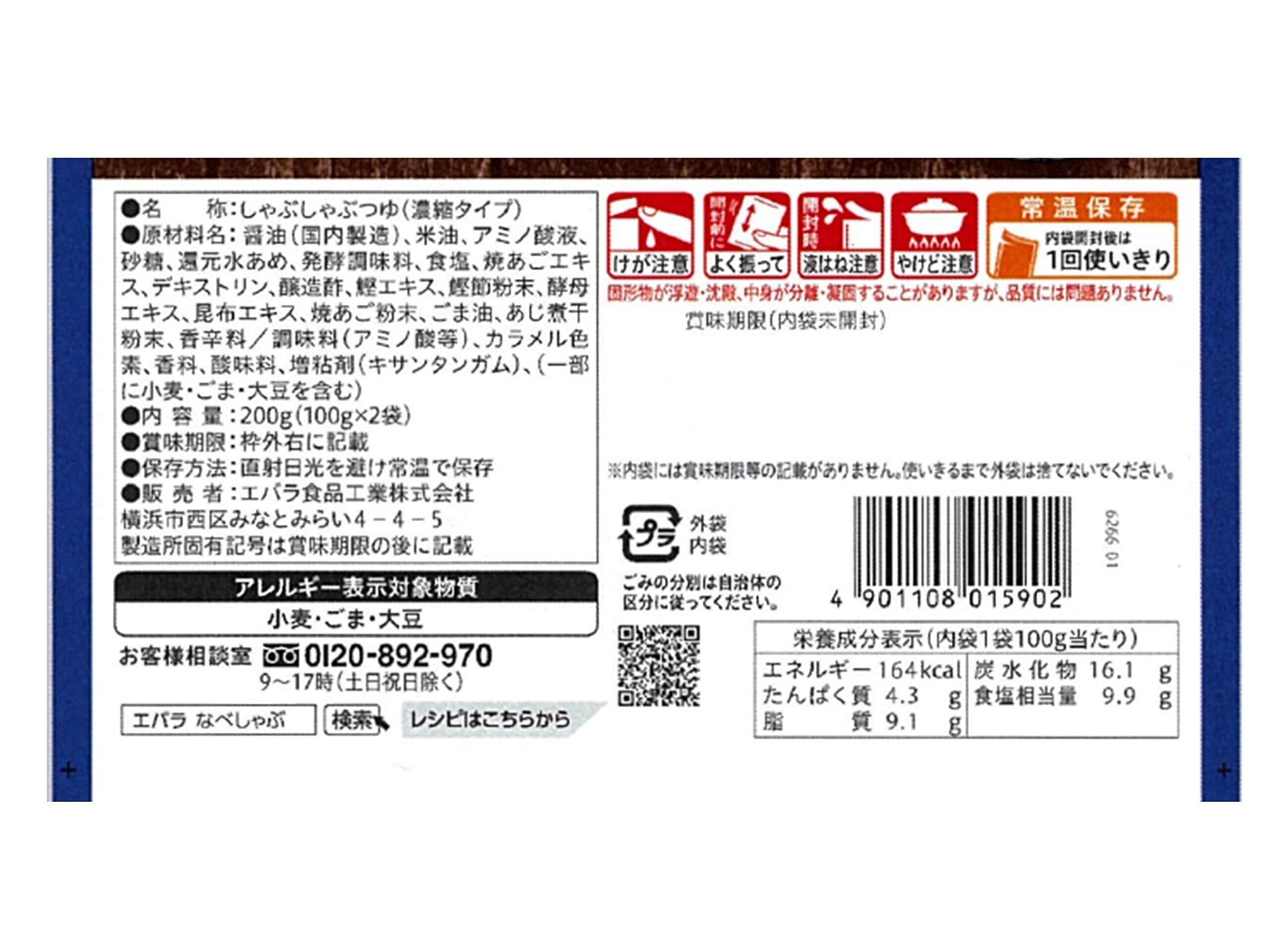 【原材料】醤油(国内製造)、米油、アミノ酸液、砂糖、還元水あめ、発酵調味料、食塩、焼あごエキス、デキストリン、醸造酢、鰹エキス、鰹節粉末、酵母エキス、昆布エキス、焼あご粉末、ごま油、あじ煮干粉末、香辛料/調味料(アミノ酸等)、カラメル色素、香料、酸味料、増粘剤(キサンタンガム)、(一部に小麦・ごま・大豆を含む)【栄養成分】内袋1袋100g当たりエネルギー(kcal)164、たんぱく質(g)4.3、脂質(g)9.1、炭水化物(g)16.1、食塩相当量(g)9.9【アレルゲン】小麦、ごま、大豆