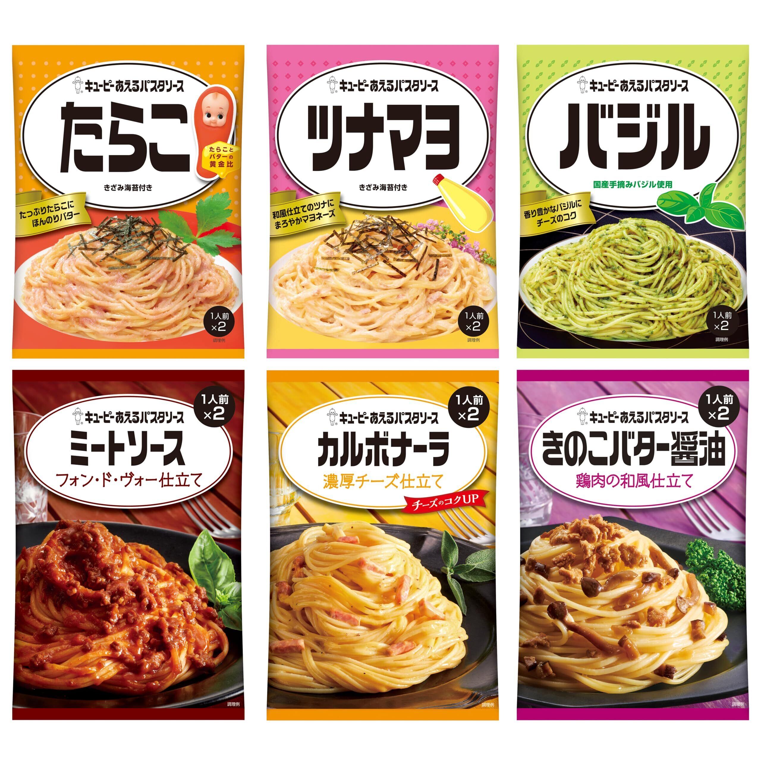 茹でたパスタにあえるだけ、キユーピーあえるパスタソースの人気の味6種類を集めました!(各2食が6種類)色々な種類を少しずつ試せるので、最後まで飽きずに楽しくパスタをお召し上がりいただけます。パスタを茹でるだけで、ソースは温める必要がないので、仕事帰りや忙しい時などに、パスタを簡単に作ることが出来て大変便利です。毎回違う味をその日の気分で楽しんだり、一緒に食べる方の好みに合わせてそれぞれ別の味を楽しんだり、生活スタイルに合わせてお召し上がりください。常備食品としてストックするのも、便利でおすすめです。【カルボナーラソース】ゆでたパスタにそのままあえるだけ!卵黄とチーズのコクをいかし、ブラックペッパーでアクセントをつけた、濃厚なカルボナーラソースです。当社独自製法によりなめらかで口当たりの良いソースに仕上げました。【たらこ】ゆでたパスタにあえるだけ! たっぷりのつぶつぶたらこをバターで仕上げた、たらこの風味豊かでコクのあるソースです。【ミートソース フォン・ド・ヴォー仕立て】ゆでたパスタにそのままあえるだけ! じっくりソテーした玉ねぎ、厳選した牛肉、完熟トマトに、ドミグラスソースとフォン・ド・ヴォーを加え、じっくり煮込んで仕上げました。 【バジル】ゆでたパスタにあえるだけ!国産のフレッシュバジルをペーストにし、にんにくとチーズでコクを加えた、香り豊かなソースです。【ツナマヨ】ゆでたパスタにあえるだけ!マヨネーズをベースに、ツナを加え、かつおだしと醤油で仕上げました。ツナのうま味がいきたマイルドなソースです。【きのこの醤油バターソース】ゆでたパスタにそのままあえるだけ!3種のきのこ(ひら茸、椎茸、エリンギ)を使用した醤油バターソースです。にんにくをきかせ、マイルドで香り豊かなソースに仕上げました。