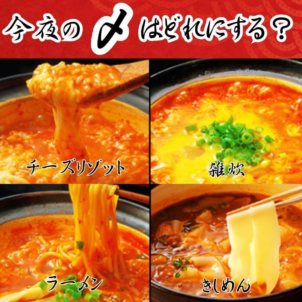 【赤から鍋の〆】鍋を楽しんだ後は、〆の一品で満足感アップ。雑炊やラーメンを加えて、スープの旨味を存分に味わいながら、心も体も温まるひとときが楽しめます。他にも、チーズリゾットやきしめんもおすすめです。赤から鍋本来のコクを残しつつマイルドな味わいへと変わり、最後まで飽きずにおいしく食べられます。