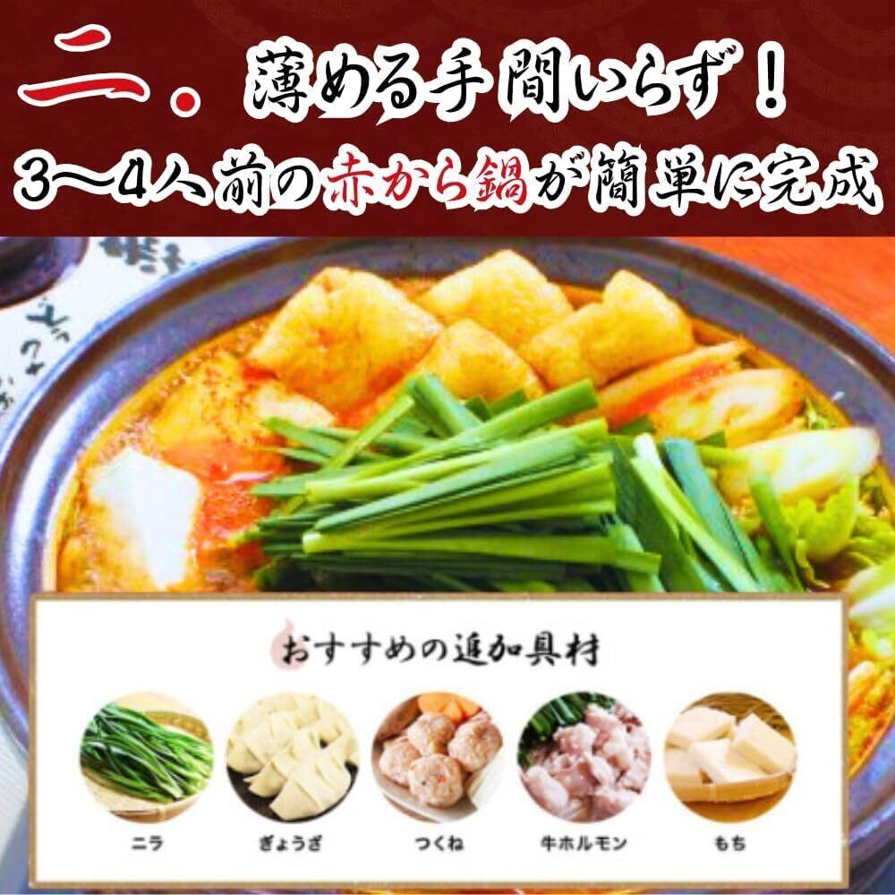 全国で大人気のお店 赤から の味をご家庭でお楽しみいただけます。 名古屋味噌にはちみつ、昆布、鰹節、オイスターソース、にんにくでうまみたっぷりのだしをとり、これに唐辛子、豆板醤、コチュジャンを加えました。 豚バラ肉、白菜、もやし、ニラ、白ネギ、とうふ、油あげ(お勧めです)をたっぷりお召し上がりください。 シメの雑炊が、またうまい!