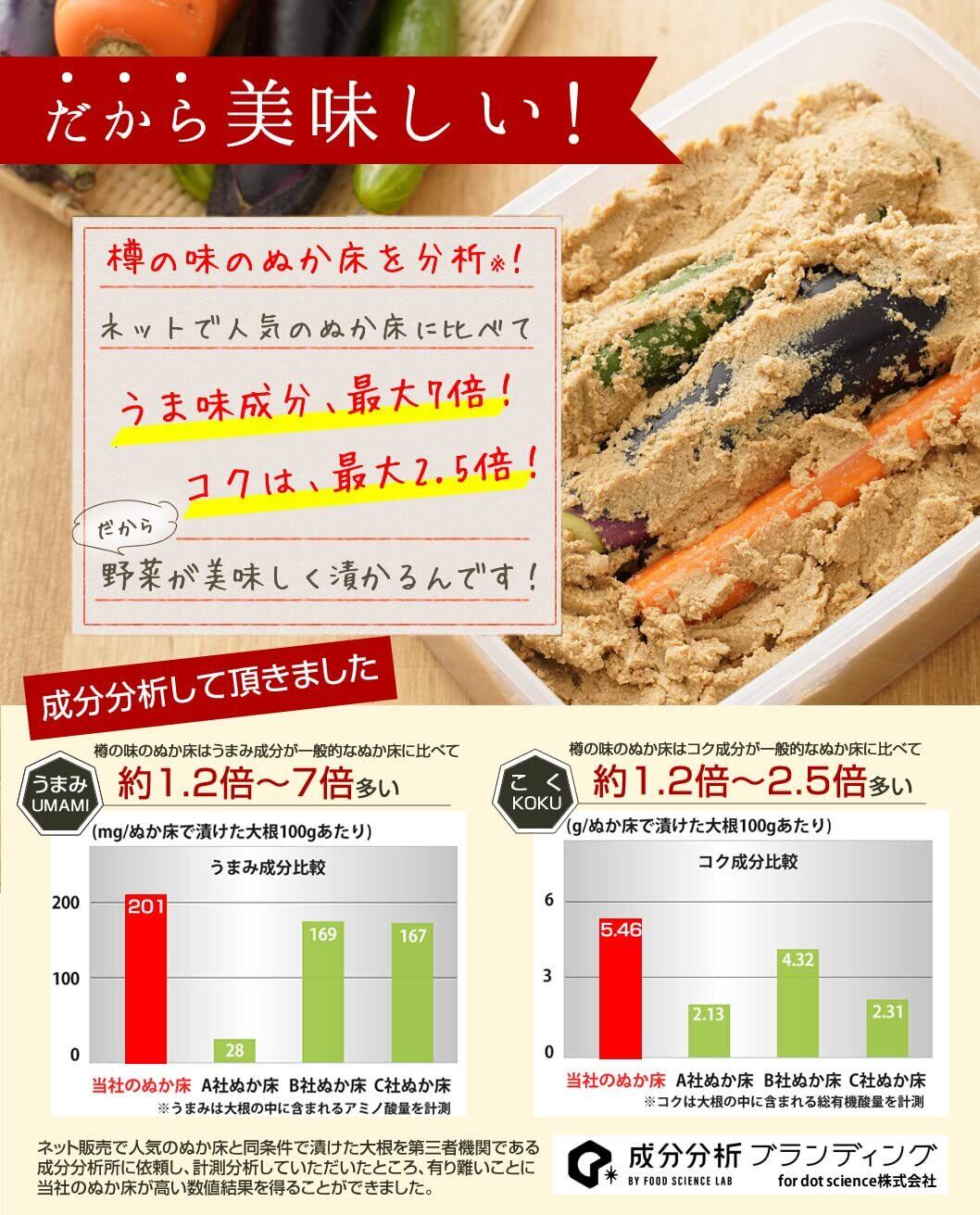 【漬物屋ノウハウの集大成】長年ぬか漬けをつくってきた漬物屋「樽の味」が研究に研究を重ねて完成させたぬか 床です。漬物屋ならではの調味料の調合率、熟成の期間、温度管理等、ありとあらゆる 知識と技術を駆使して仕上げました。