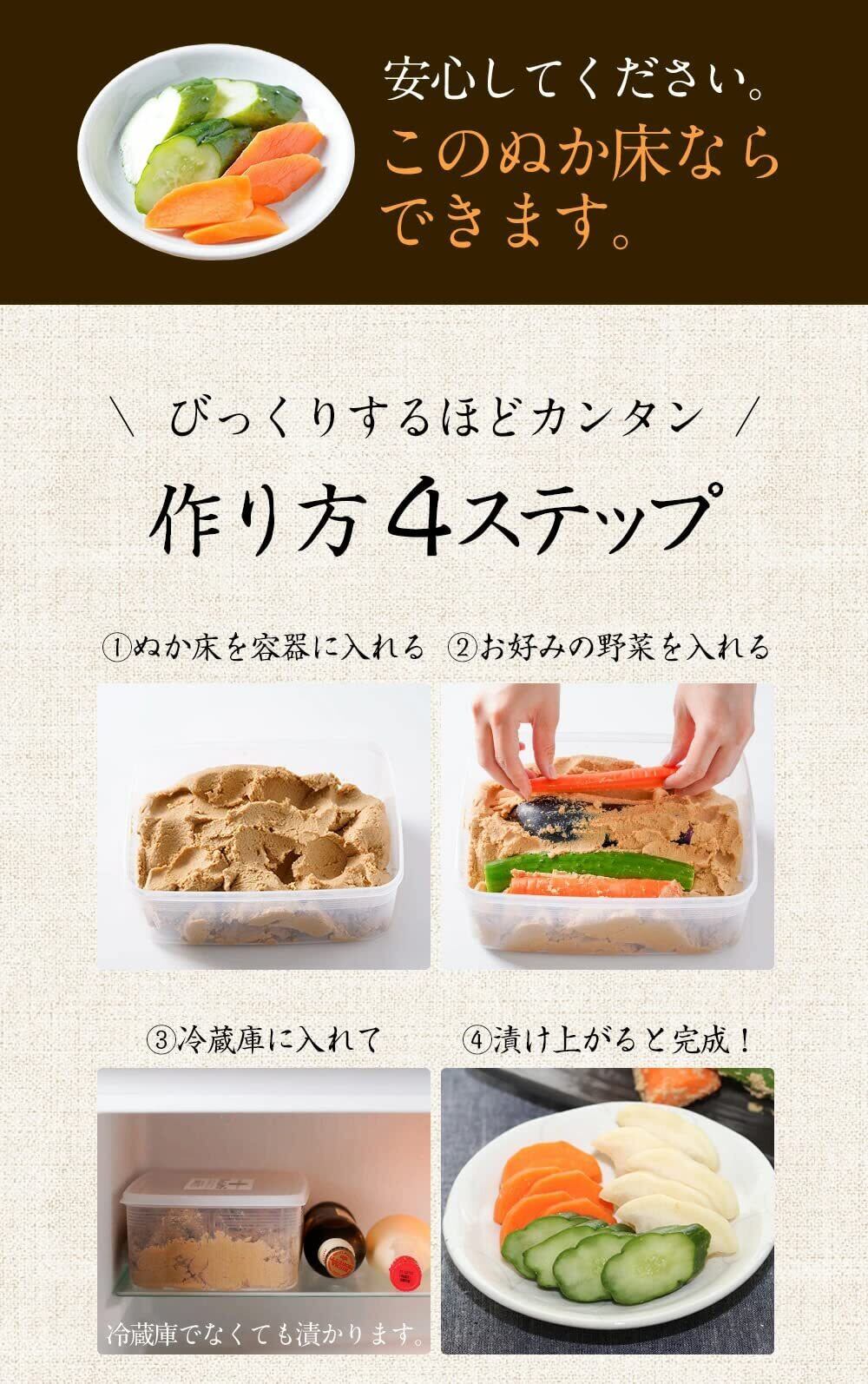 【誰でもカンタンに漬かるぬか床】ご家庭でぬか漬けを作ろうとすると本来はすごく手間がかかるものなのです。「野菜の捨て漬け」といってクズ野菜等を使って試し漬けをして、ぬか床を慣れさせなければなりません。しかしながら「漬けもん屋のぬか床」には捨て漬けは必要ありません。誰でもカンタンに一回目から美味しく漬けることができるのです。