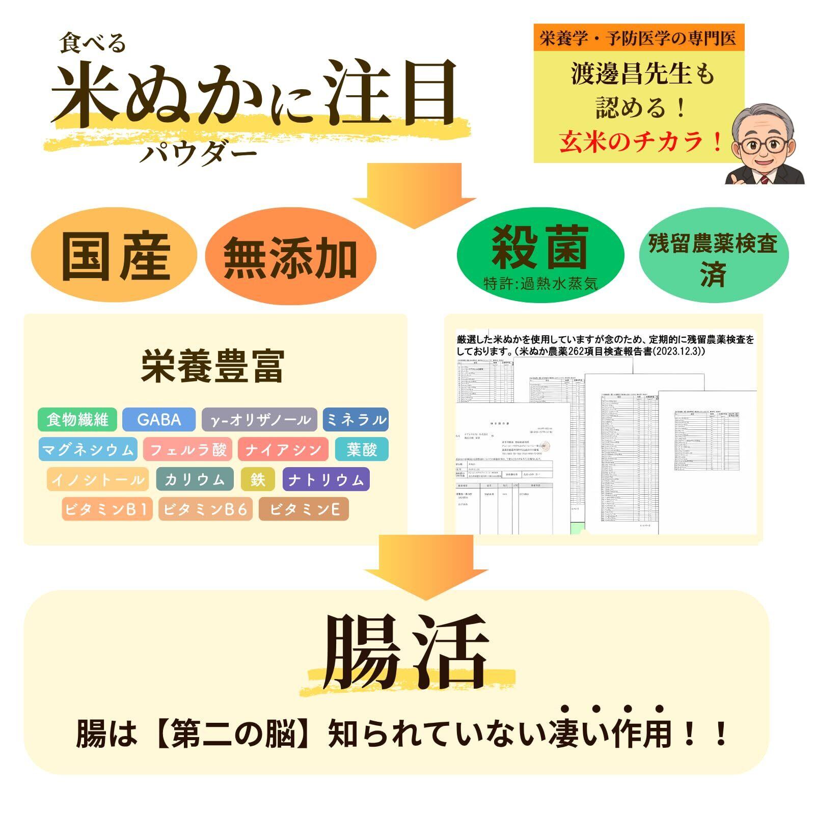 ・【商品】 食べる米ぬかパウダー ・【原材料】米ぬか(国内製造)独自の過熱水蒸気技術で殺菌~乾燥を行い、同時に水蒸気効果により、 炊飯したご飯のように仕上げることができました。 ・【内容量】250g×1個入り (粉末 パウダー) ・【原産国】日本(島根県産米100%使用)国産 ・【安心・安全にこだわる】原料から製造工程まで細かく検査を行っております。米ぬかの残留農薬は しっかり検査。厚生労働省登録機関において262項目全てにおいて残留農薬が検出されなかった 米ぬかのみ使用 ・【無添加・無着色】加工食品に含まれる、人工甘味料や香料・着色料・保存料などの添加物は 一切使用していません。島根県産の素材をパウダーにしたものをそのままお届けいたします。 ・【栄養パワー】米ぬかには食物繊維をはじめ、栄養価の高い成分が多く含まれております。 イノシトール、γオリザノール、GABA、ビタミンB、フェルラ酸など、普段の食事で不足しがちな 成分を たっぷり含んでいます。特に腸内フローラを整える効果には特筆すべき効果を発揮します。 ・【食べて腸活!】朝はヨーグルト、みそ汁、トースト、サラダ 夜はカレー、ラーメンなどに 大さじ1杯をまぜてお召し上がりください。グルテンフリー ※ヨーグルトは混ぜずにかけて、そのまま食べた方が甘みを感じられます。ハチミツをかけても良いです