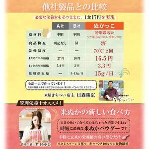 【製品の販売経緯】 コロナ過の中、出歩けない妊婦さんの体調管理のために作った製品が多くの方から大変ご好評を戴き一般販売を開始しました。 【安心・安全・美味しさの追求】 精米により出来た米ぬかは時間の経過と共に酸化が進みます。精米したての米ぬかをふるいにかけて本当に綺麗な米ぬかだけを加工することで酸化を防ぐだけなくな、く究極の美味しさを実現しました。その証として当店はお米の精米日・加工日を記載しております。 【玄米のこだわり】 米ぬかの原料即ち玄米は特別栽培米(農薬・化学肥料を50%以上削減)の山形県つや姫・北海道ゆめぴりか、YES!CLEAN米(環境に配慮し安心・安全で高品質なお米)を使用しております。 【賞味期限について】 加工した翌日に日本食品分析センターにて「酸化物・過酸化物価・一般細菌・大腸菌等々」の検査と3ヵ月常温保管した製品も同様の検査をして安全性を確認しています。高温・多湿を避け密封容器(ジップ可)での保存では安心してお召し上がり戴けますが、」食品なので頻度良くご購入することをお薦めしています。