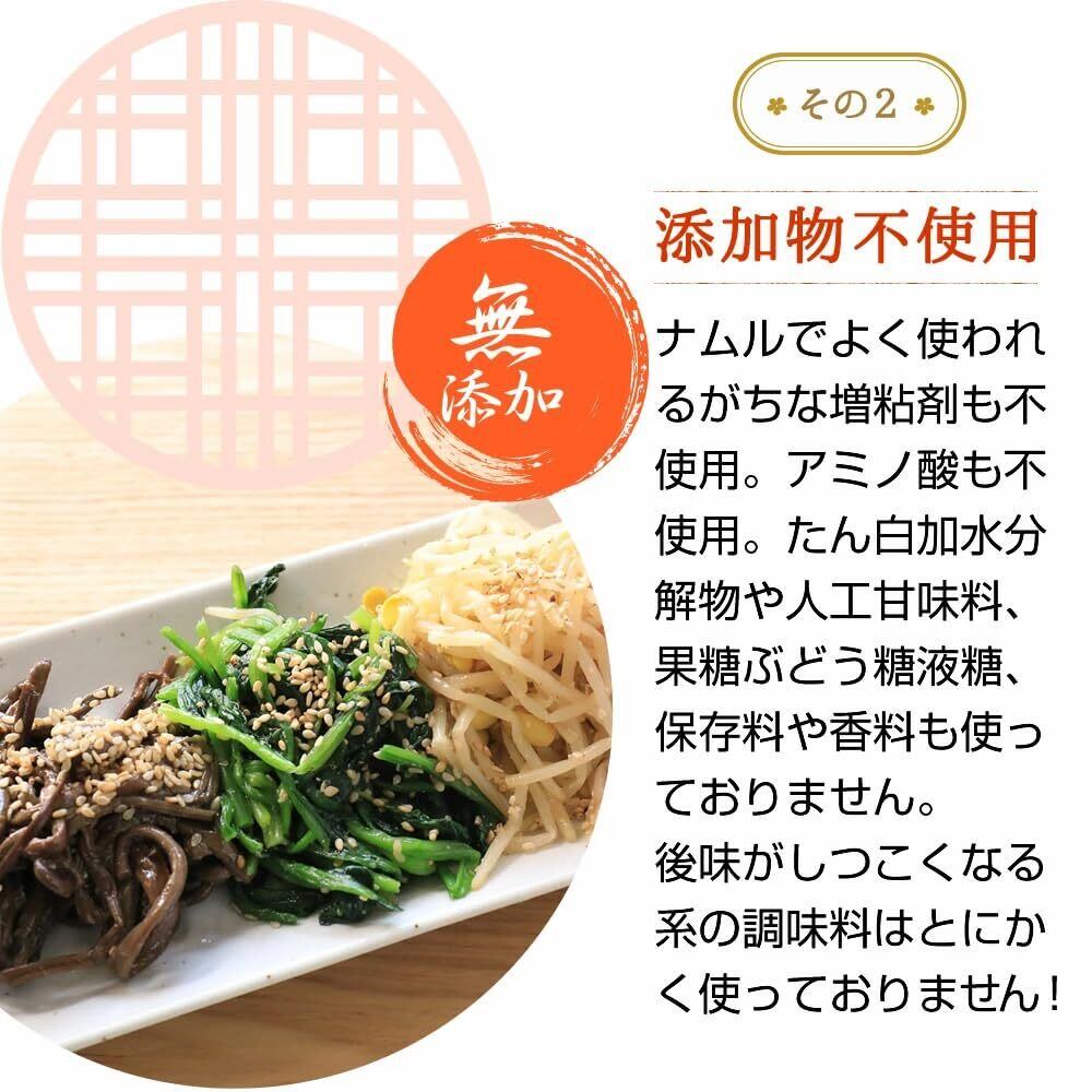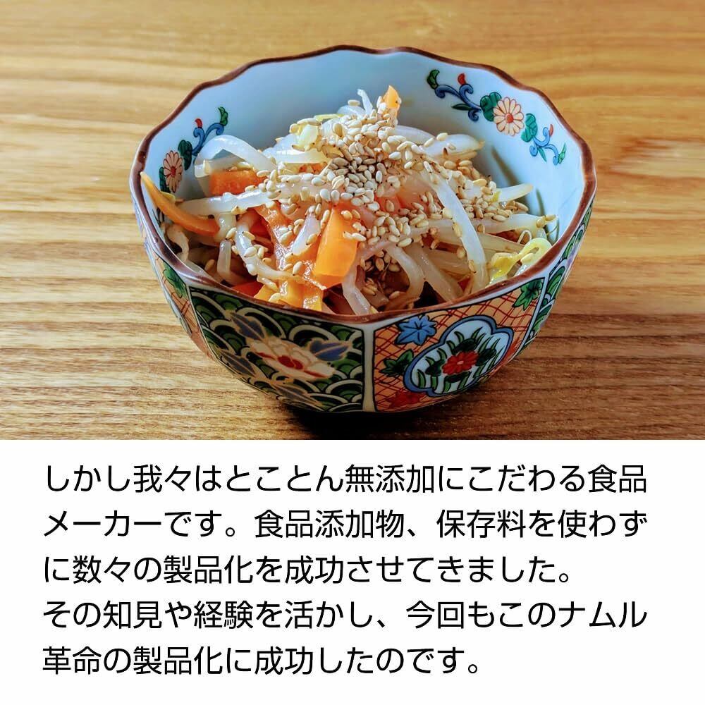 【無添加の手作りナムル】原材料:澱粉分解物(国内製造)、乾燥野菜パウダー(にんにく、たまねぎ、しょうが、ねぎ)、食塩、砂糖、酵母エキス、粉末醸造酢、魚醤パウダー、しいたけエキスパウダー、昆布パウダー