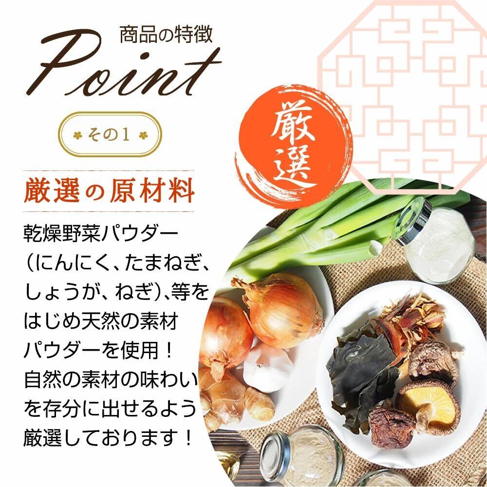 澱粉分解物(国内製造)、乾燥野菜パウダー(にんにく、たまねぎ、しょうが、ねぎ)、食塩、砂糖、酵母エキス、粉末醸造酢、魚醤パウダー、しいたけエキスパウダー、昆布パウダー