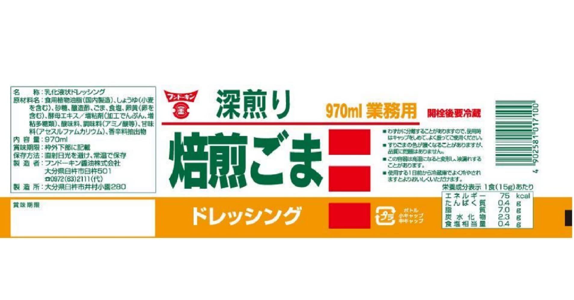 原材料:食用植物油脂、しょうゆ(脱脂加工大豆(遺伝子組み換えでない)、小麦を含む)、砂糖、醸造酢、ごま、食塩、卵黄、増粘剤(加工でんぷん、増粘多糖類)、酸味料、調味料(アミノ酸等)、甘味料(アセスルファムカリウム)、香辛料抽出物 栄養成分:15mlあたり エネルギー 72kcal、たんぱく質 0.4g、脂質 6.7g、炭水化物 2.6g、ナトリウム 170mg