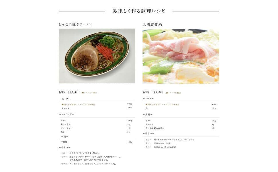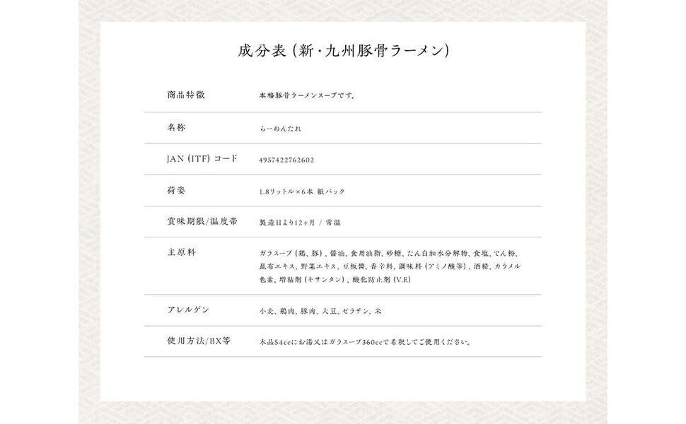 九州の新鮮な豚骨を長時間炊きこみ、本場の味を再現しました。コクのある豚骨スープの香りと特製マー油が独特の風味を出しています。鍋スープとしてもおすすめです。じっくり煮出して仕上げた深い味わいです。紙パックのため、容器処理が簡単です。キャップ付きですので、開封後も衛生的に保管ができます。素材から炊き出し、包装まで一貫生産しております。使用方法は、本品54CCにお湯またはガラスープ360CCで伸ばしてください。