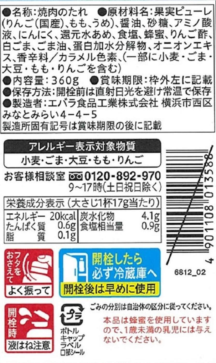 【原材料】果実ピューレ(りんご(国産)、もも、うめ)、醤油、砂糖、アミノ酸液、にんにく、還元水あめ、食塩、蜂蜜、りんご酢、白ごま、ごま油、蛋白加水分解物、オニオンエキス、香辛料/カラメル色素、(一部に小麦・ごま・大豆・もも・りんごを含む)【栄養成分】大さじ1杯17g当たりエネルギー(kcal)20、たんぱく質(g)0.6、脂質(g)0.1、炭水化物(g)4.1、食塩相当量(g)0.9【アレルゲン】小麦、ごま、大豆、もも、りんご