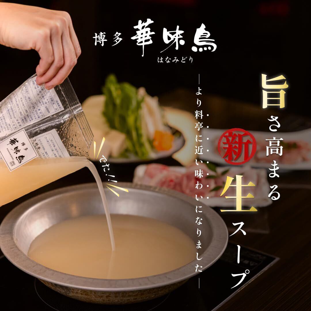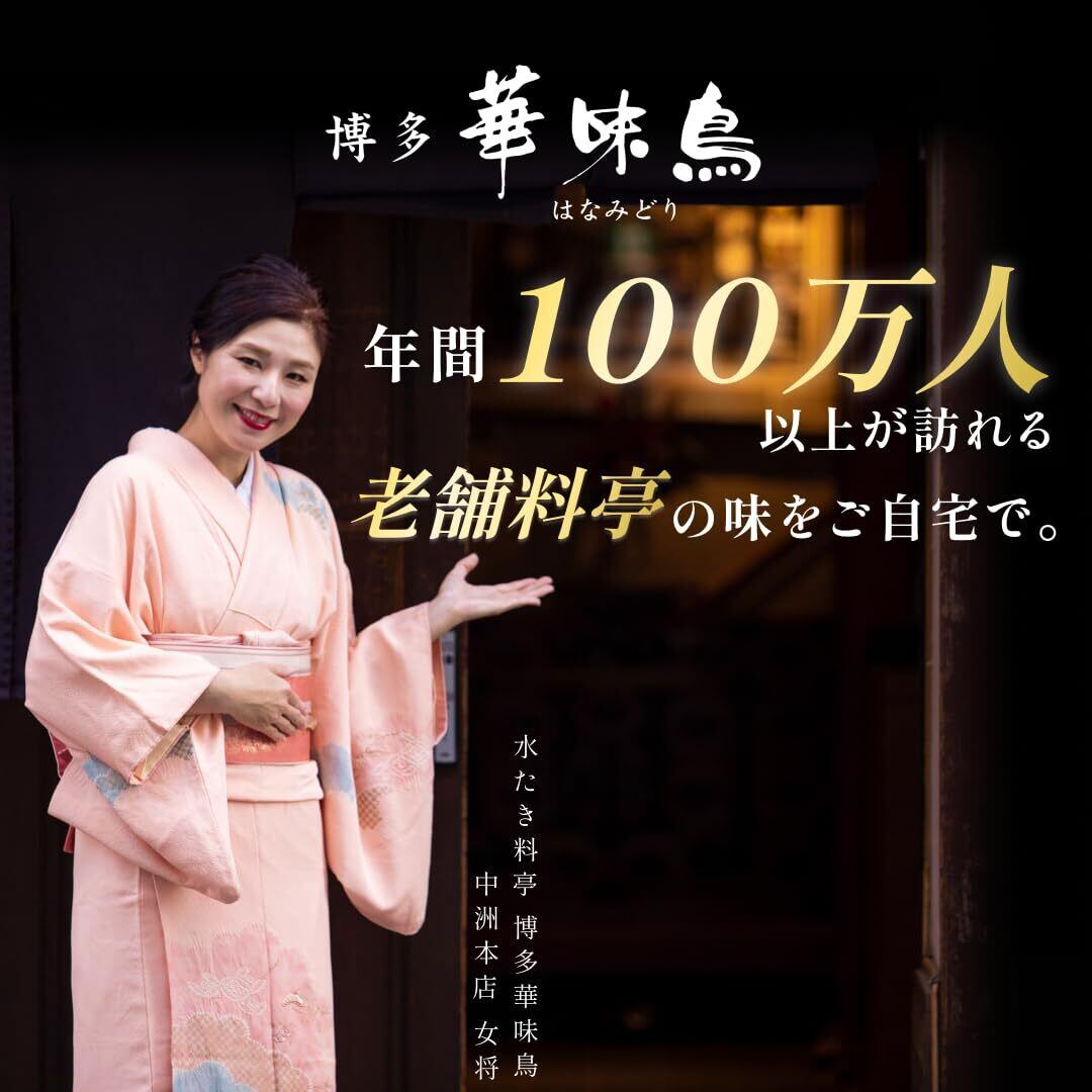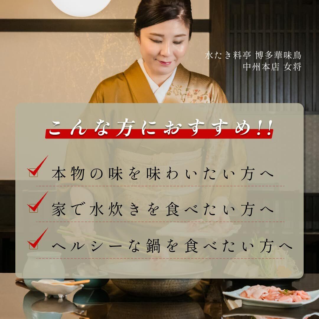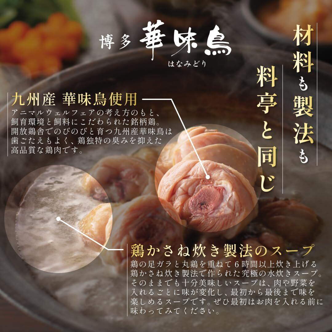 「料亭の味をご家庭で」 老舗料亭 博多華味鳥が贈る水炊きセット。 ご自宅で簡単に料亭と同じ味を味わうことのできるセットです。 創業以来75年間こだわり続けたスープとお肉の味を存分に味ご堪能ください。